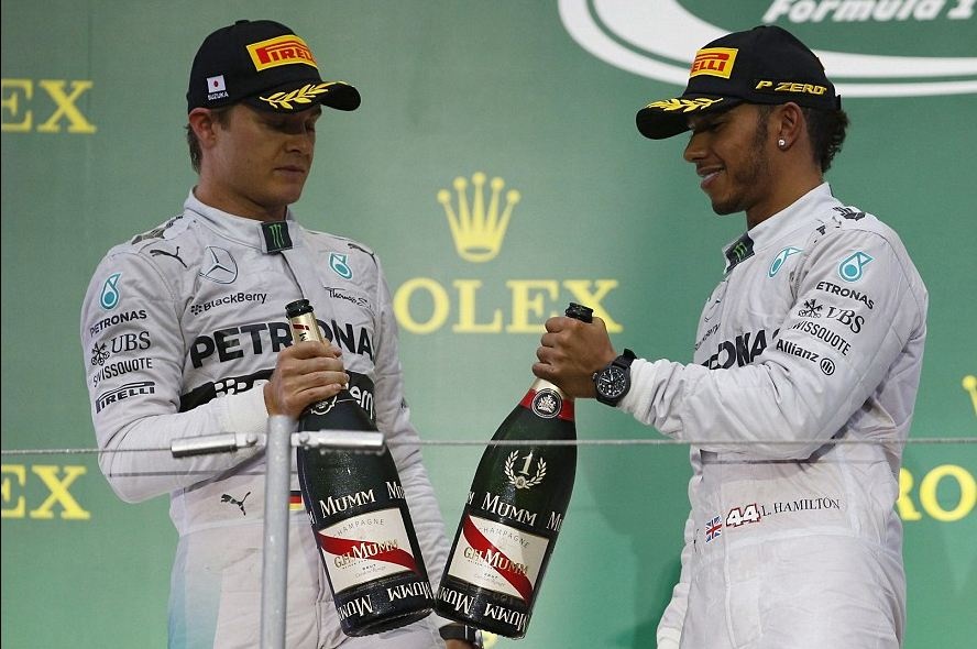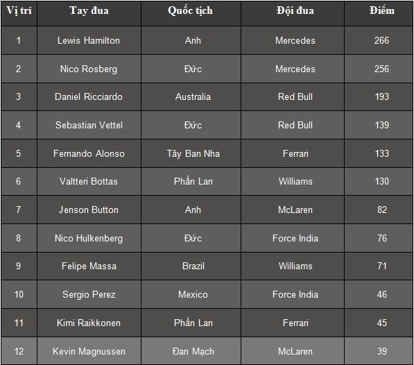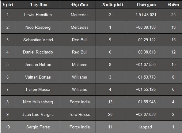 | Trong khi Hamilton tỏ ra vui vẻ thì gương mặt của đồng đội Rosberg lại khá buồn. Việc chỉ về đích ở vị trí thứ 2 khiến tay đua người Đức để "viên ngọc đen" bỏ xa 10 điểm trên BXH tổng, trong bối cảnh mùa giải 2014 chỉ còn 4 chặng nữa là kết thúc.