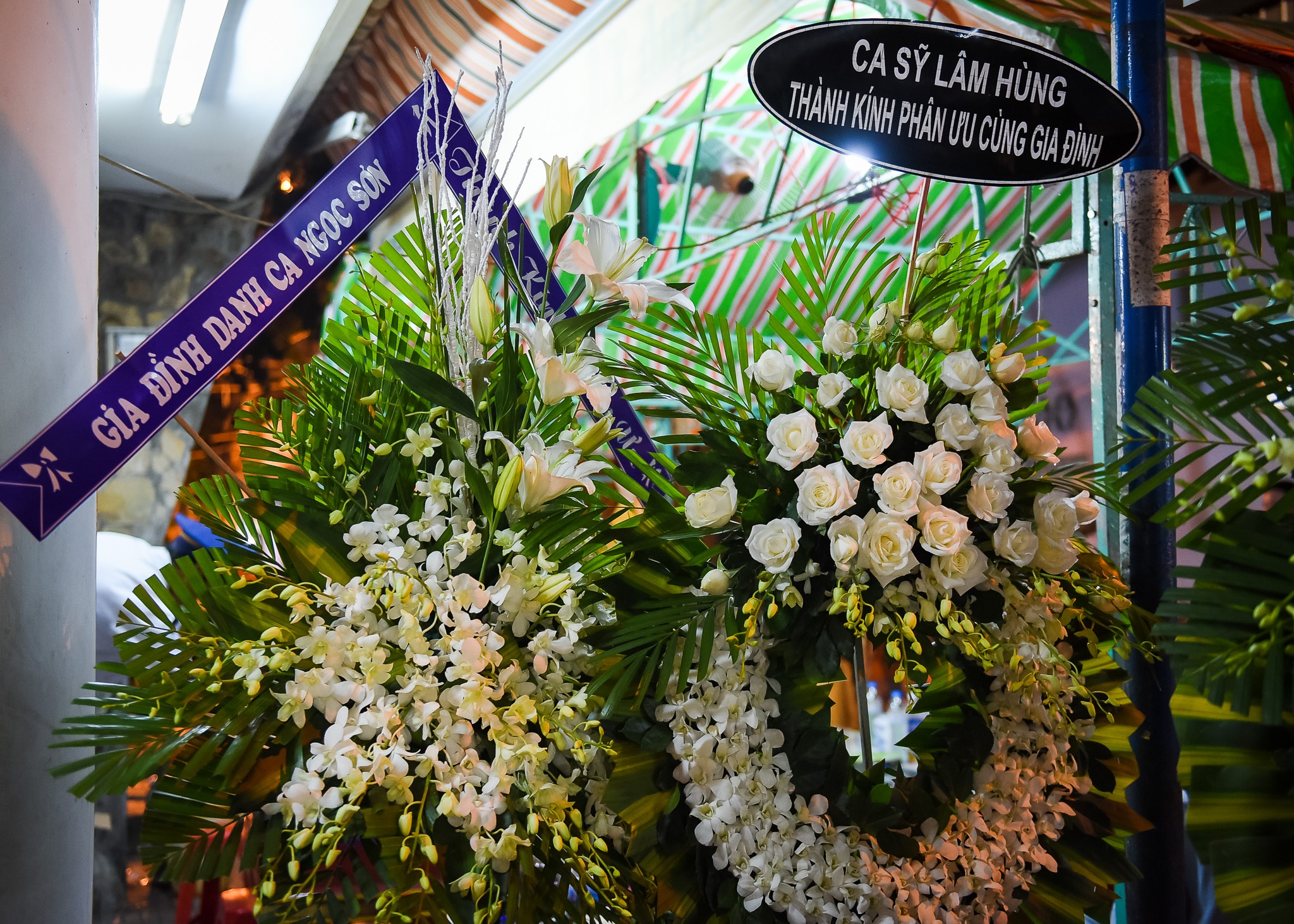 | Các nghệ sĩ gửi hoa viếng ông bầu Duy Ngọc. Ảnh: Bá Ngọc |