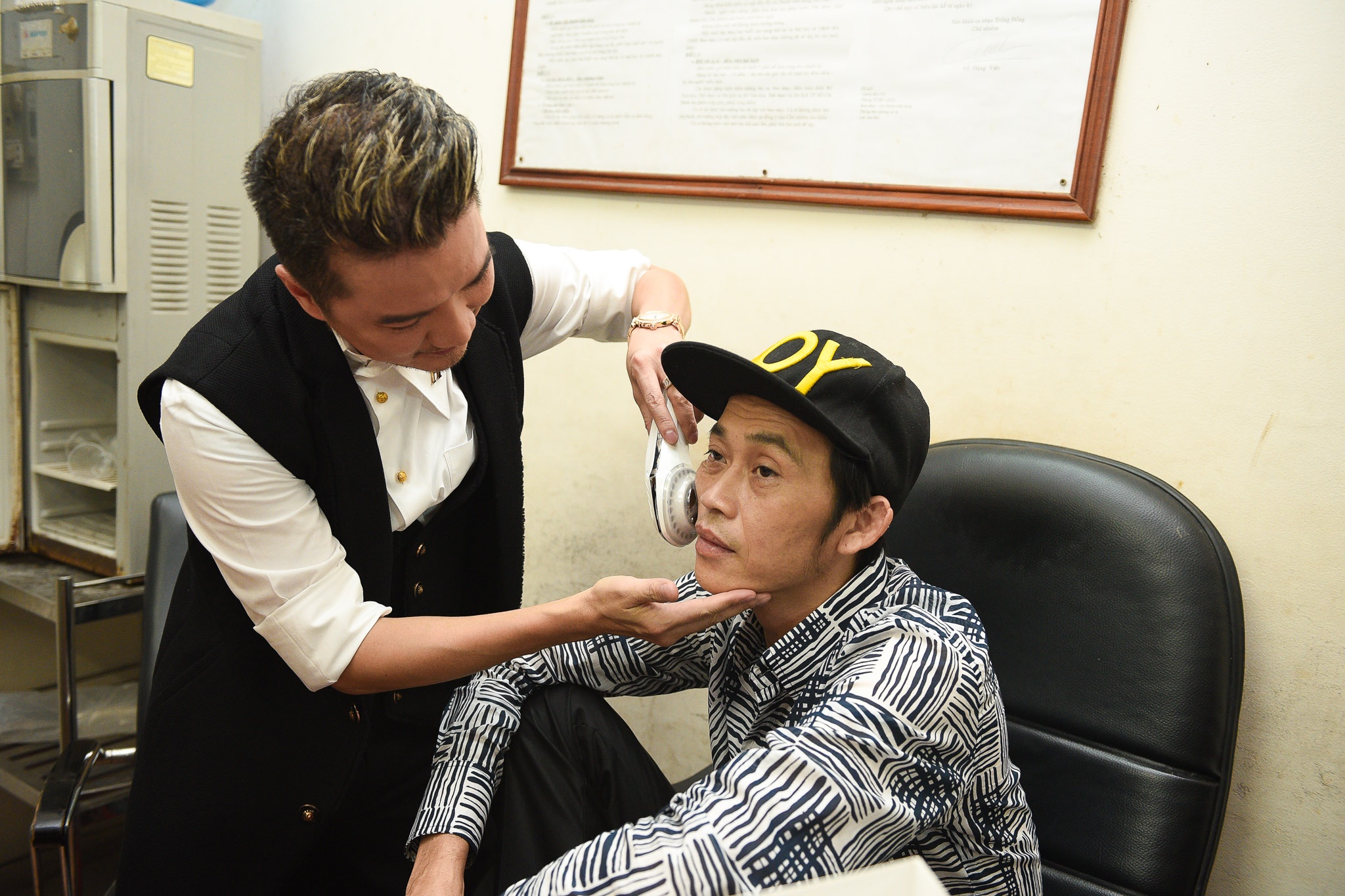 Gặp nhau trong live show Trường Giang, ông hoàng nhạc Việt thể hiện sự quan tâm với "sư phụ" bằng cách lấy máy massage da mặt cho anh.
