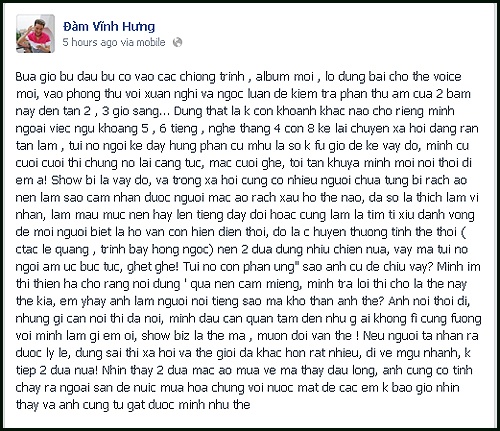 Theo những chia sẻ được đăng tải trên trang cá nhân, dư luận có thể cảm nhận được sự ung dung tự tại của Đàm Vĩnh Hưng bất chấp việc có nhiều luồng dư luận trái chiều đang chĩa vào mình, Anh viết: "Nghe thằng 4, con 8 kể lại chuyện xã hội đang rần rần lắm, tụi nó ngồi kể đầy hưng phấn... Mình cứ cười cười thì chúng nó lại càng tức. Mắc cười ghê, tới tận khuya mình mới nói: Thôi đi em ạ, showbiz là vậy đó. Và trong xã hội cũng có nhiều người chưa từng bị rách áo nên làm sao cảm nhận được người mặc áo rách xấu hổ thế nào...".