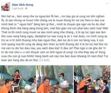 Mới đây, chia sẻ trên trang cá nhân, anh viết: "Mới đi hát về, tắm xong nhẹ cả người. Mọi người bây giờ ai cũng nói ĐVH nghiện facebook, đi sau nhưng về trước. Chẳng qua là muốn thông tin với các fan yêu dấu của mình biết rõ "người tình" đang làm gì thôi.