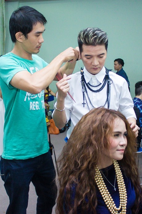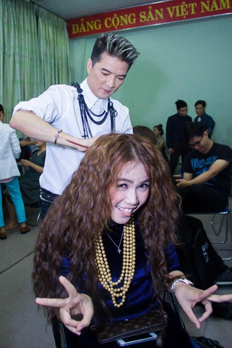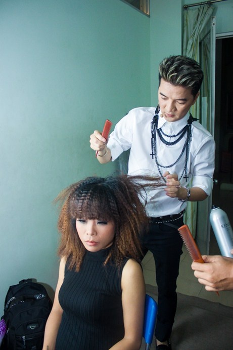 | Trong hậu trường, "ông Hoàng nhạc Việt" trổ nghề tay trái khi tự tay làm tóc cho các thí sinh. Là người cầu toàn, Mr Đàm không chỉ truyền lại những kỹ năng chuyên môn, anh muốn các học trò hoàn hảo từ cách ứng xử trong cuộc sống, cho đến ngoại hình bên ngoài. |
