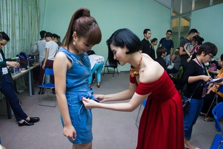 | Vũ Thu Phương chỉnh sửa trang phục giúp các thí sinh. |