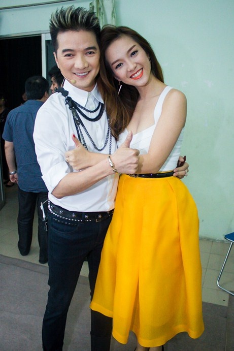 | Đinh Hương và Mr Đàm thân thiết tại hậu trường. |