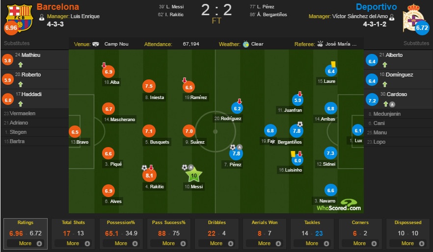 Khuyết mũi tấn công nguy hiểm nơi hành lang cánh trái, Barcelona chủ yếu trông chờ vào khả năng khoan phá từ Lionel Messi và Luis Suarez. Dẫu vậy, trước hàng thủ thi đấu tập trung và được tổ chức rất tốt của Deportivo, các chân sút đội chủ nhà cũng gặp không ít khó khăn.