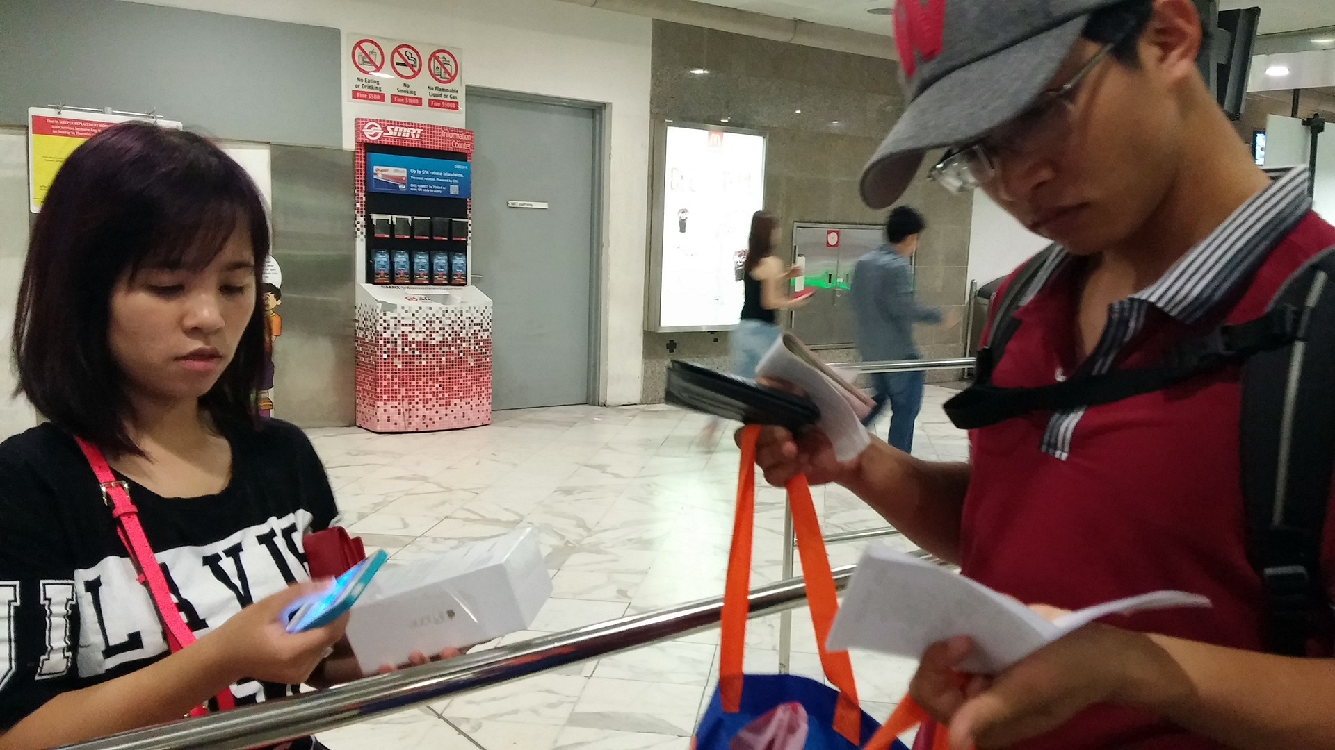 | Một du học sinh tại Singapore giao iPhone 6 cho một cửa hàng ở TP.HCM ở ga tàu điện ngầm Bugis. |