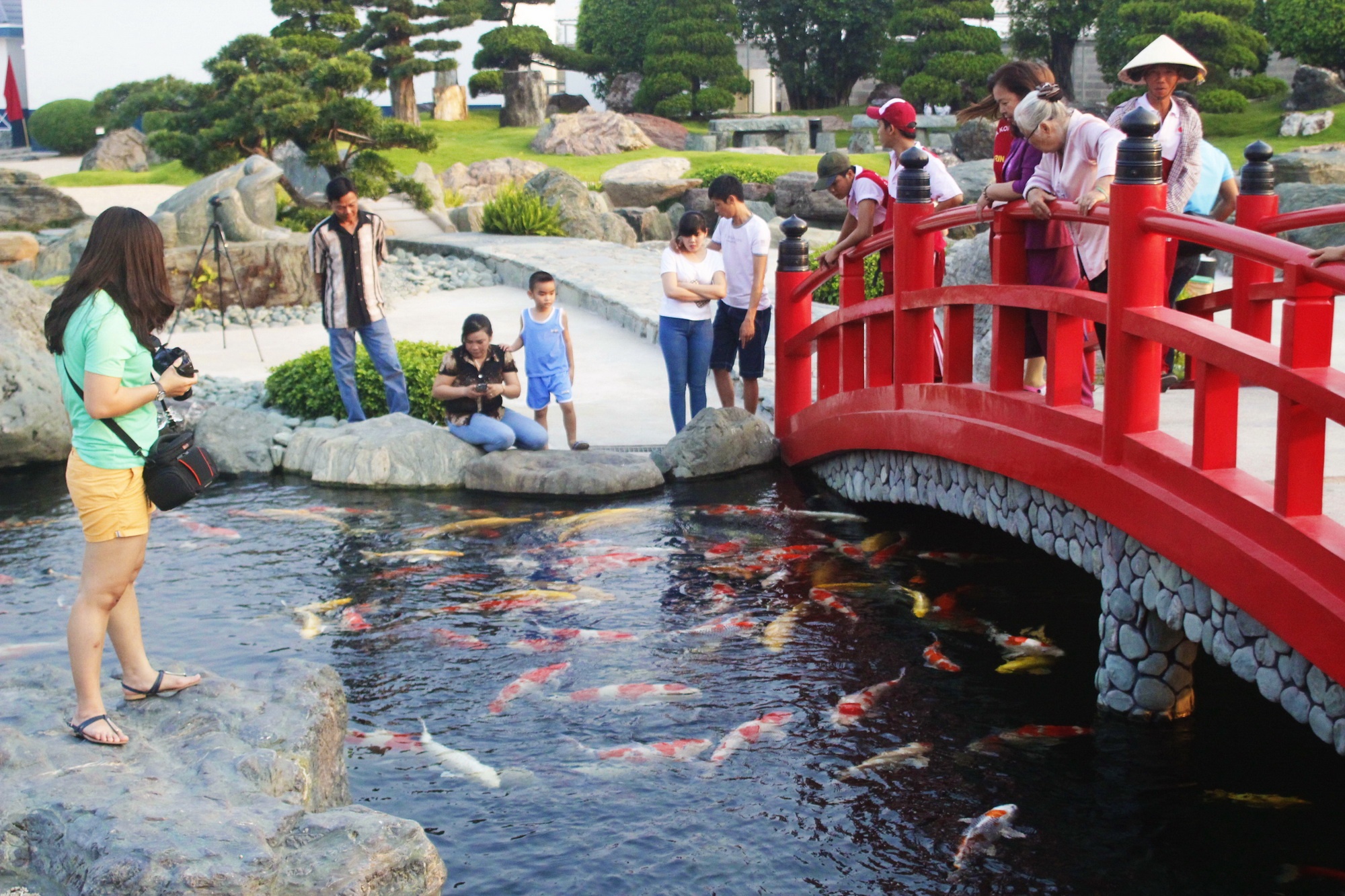 | ... Nhưng khu vực thu hút người tham quan là hồ nước dưới cây cầu, nơi hơn 200 con cá chép quý hiếm của Nhật Bản bơi lội. Những con cá chép này thuộc dòng cá Koi, được xem là đem lại sự thịnh vượng, giàu có và may mắn. |
