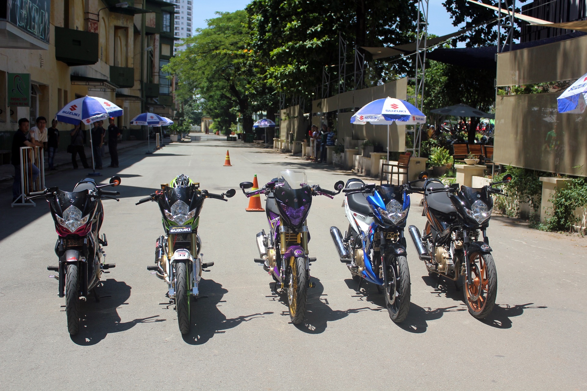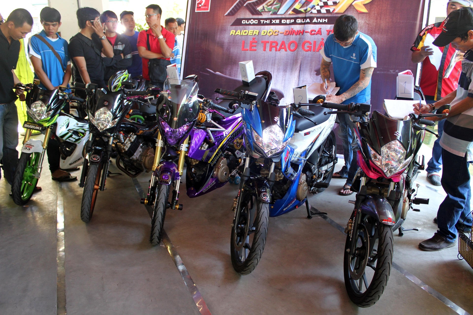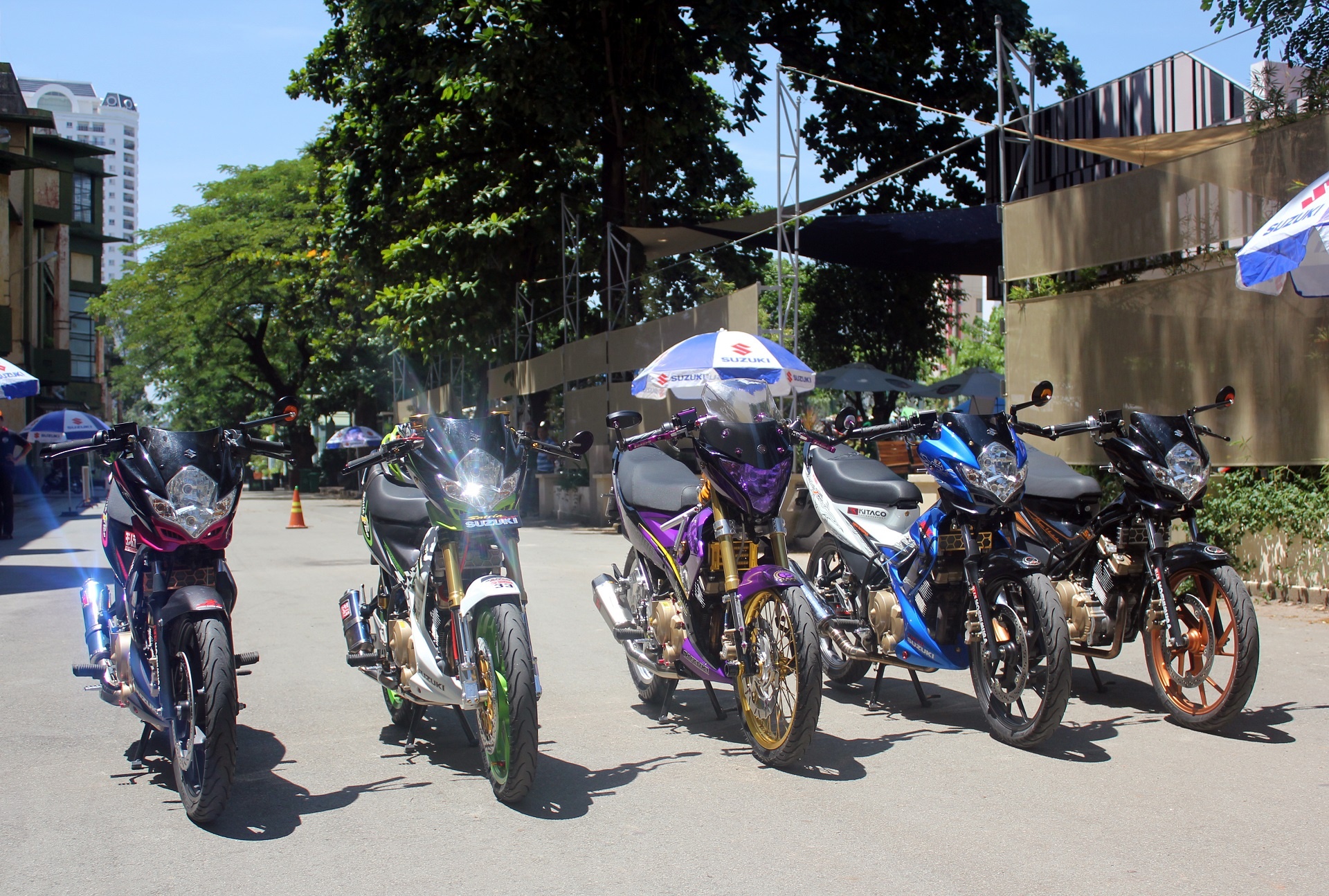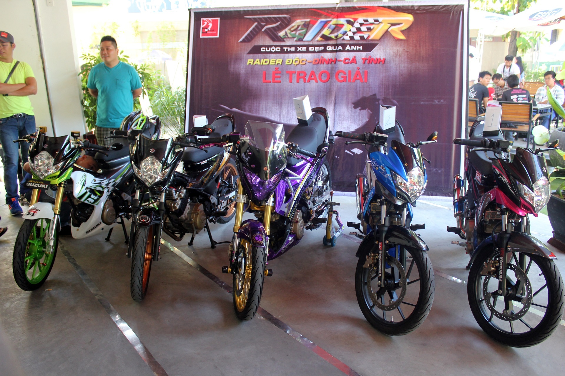 | Trong số 5 chiếc Raider này, 2 chiếc màu xanh và tím đã từng tham gia gian hàng của Suzuki tại Vietnam Motorbike Festival 2014 và đã nhận được sự quan tâm của khách tham quan. |