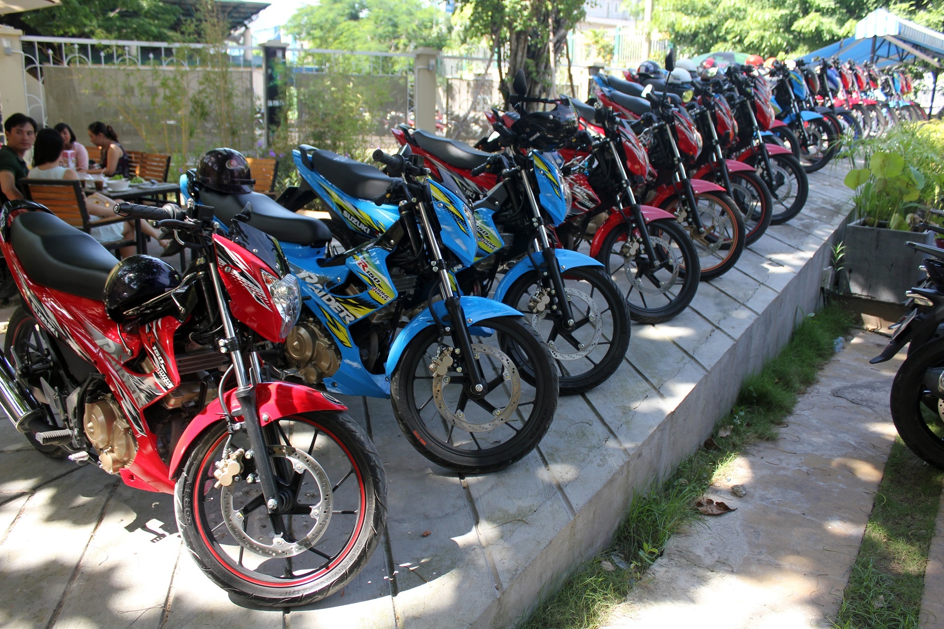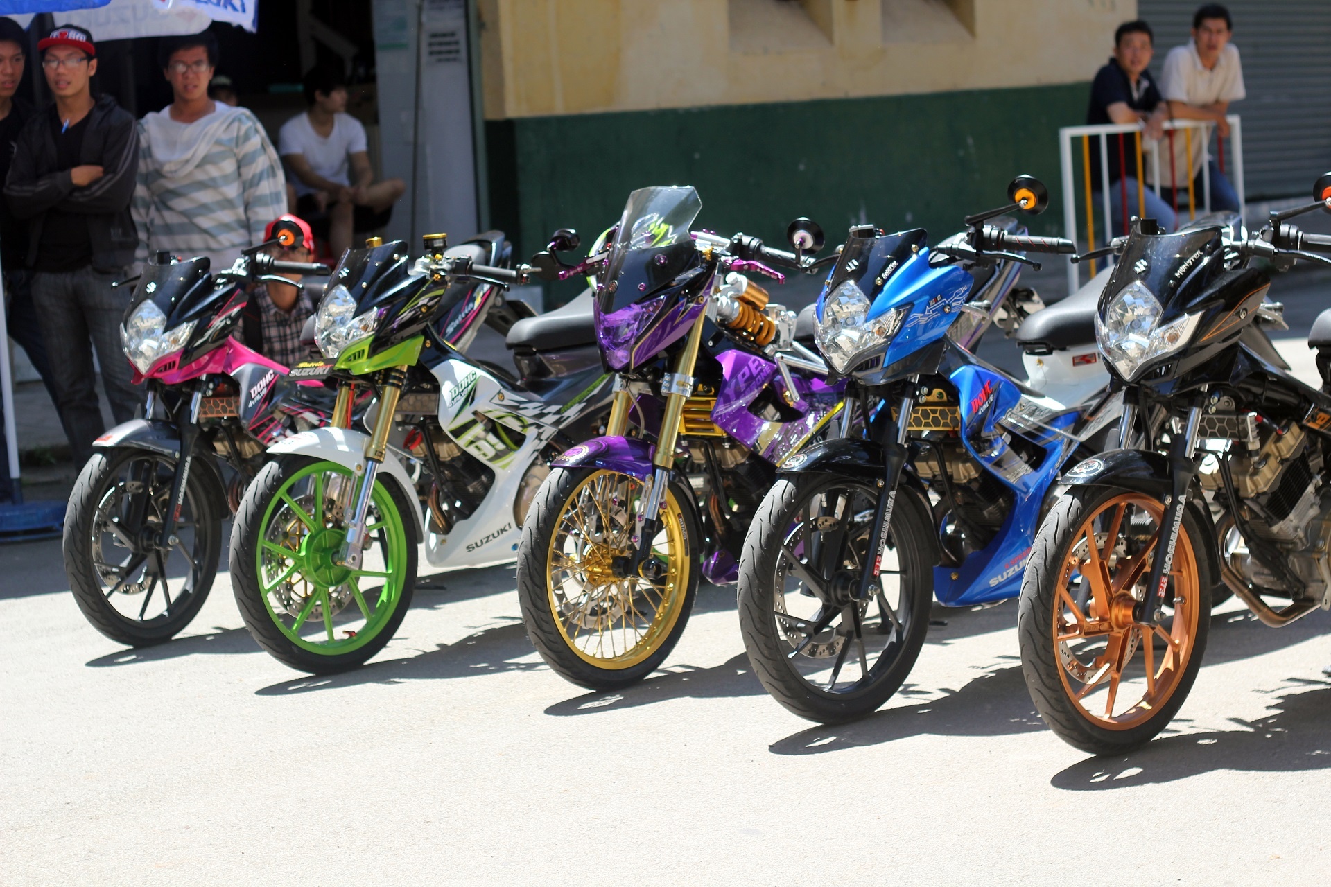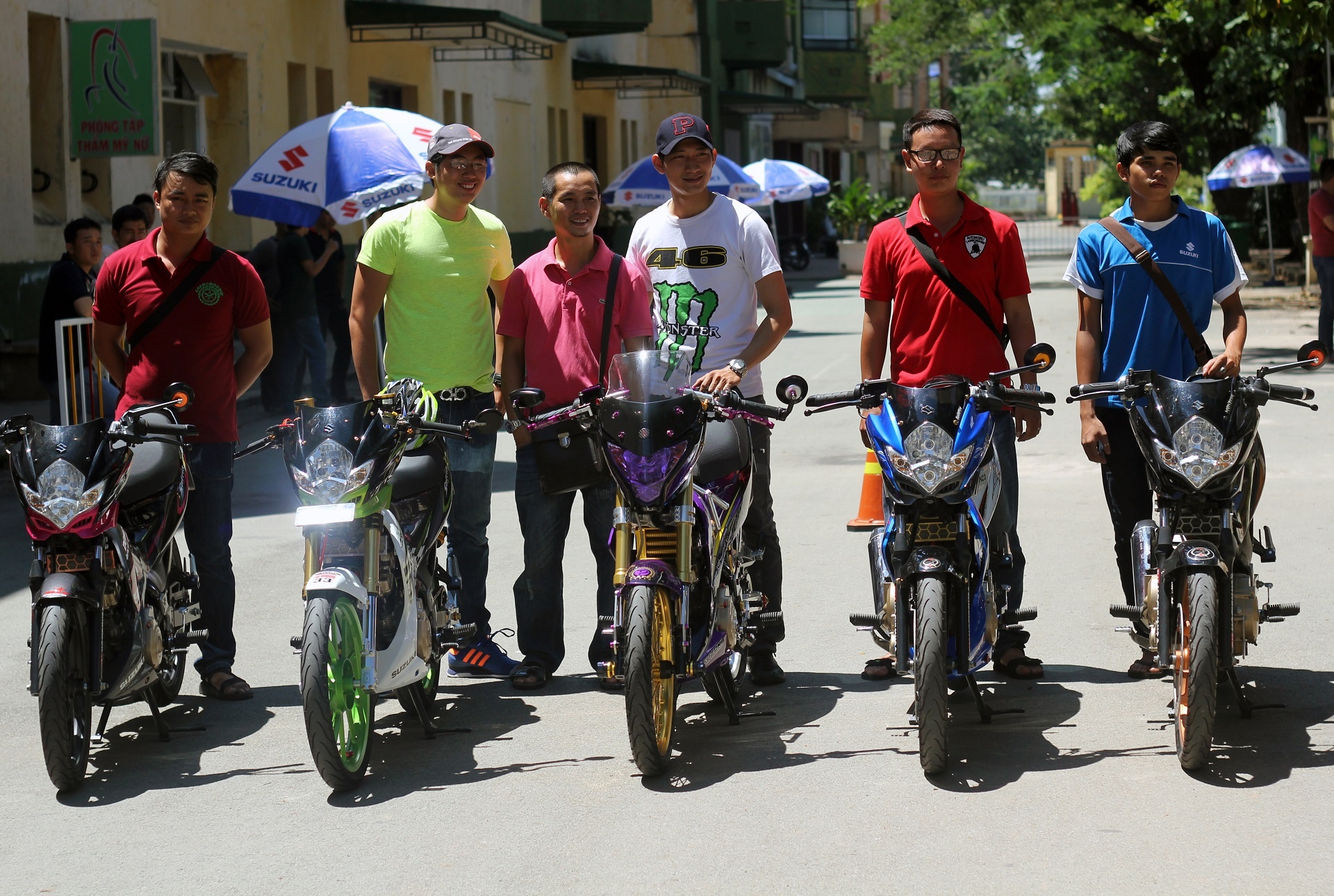 | Trong số 5 chiếc Raider này, 2 chiếc màu xanh và tím đã từng tham gia gian hàng của Suzuki tại Vietnam Motorbike Festival 2014 và đã nhận được sự quan tâm của khách tham quan. |
