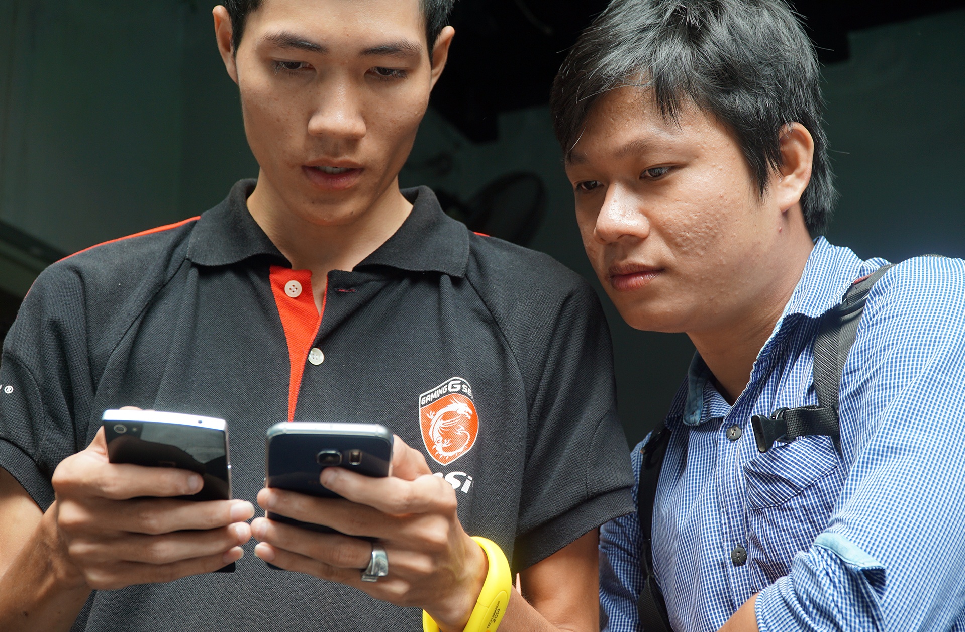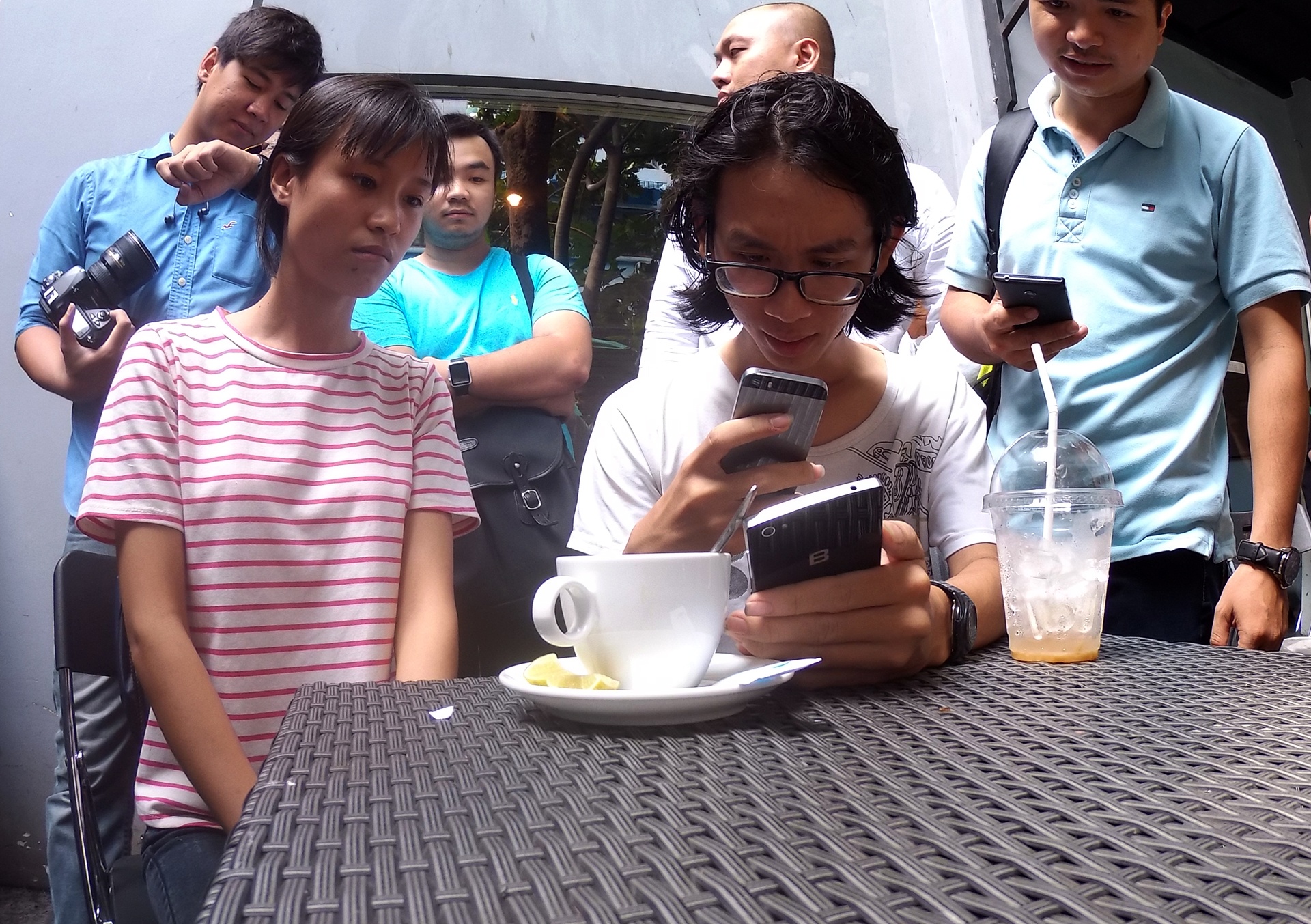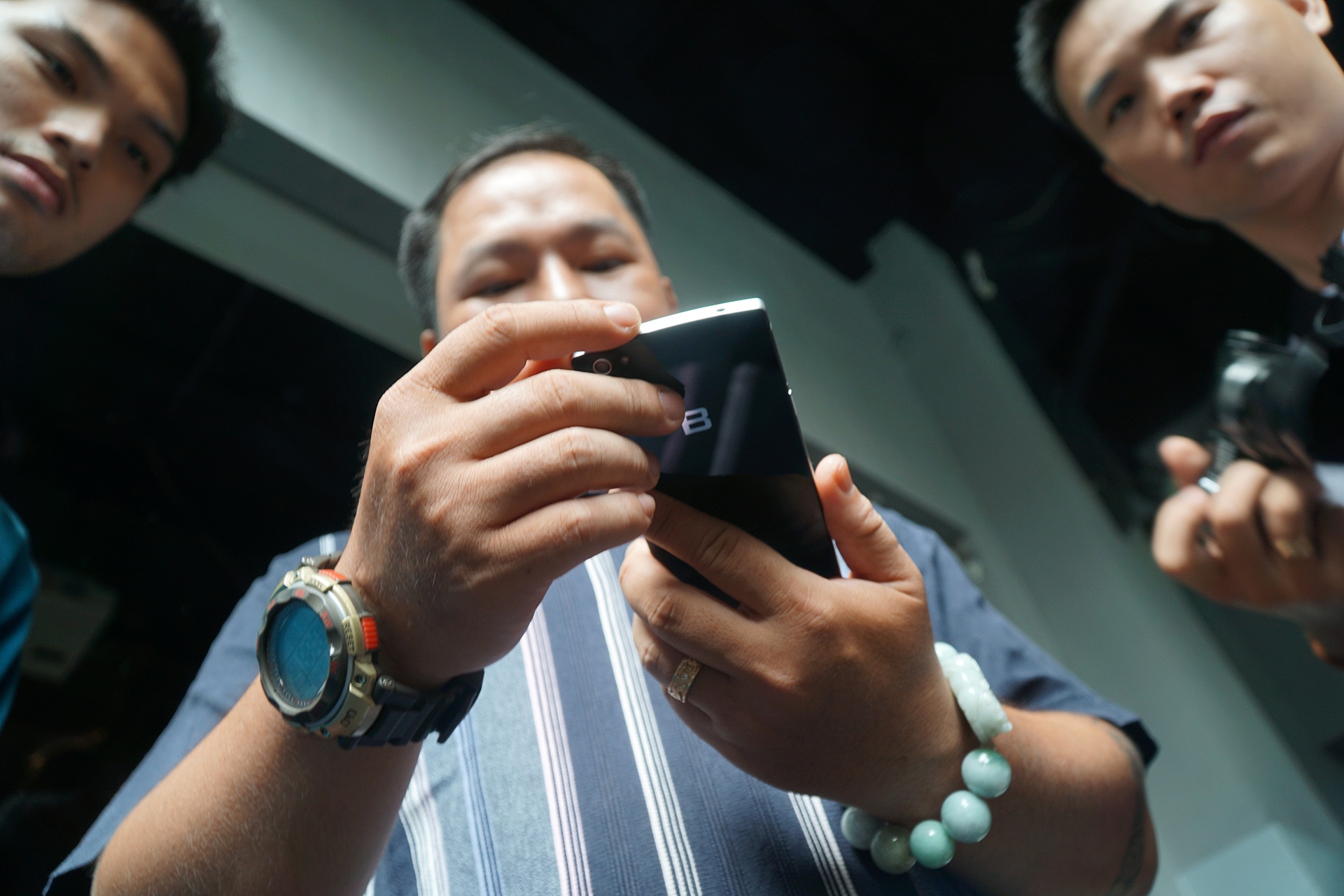 | Sáng 24/6, nhiều fan công nghệ tại TP HCM tập hợp để dùng thử Bphone. Hai chiếc máy đều được giao tại Hà Nội trong một vài ngày trước và mang về TP HCM. |