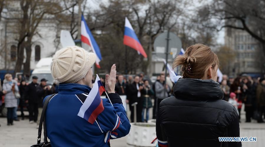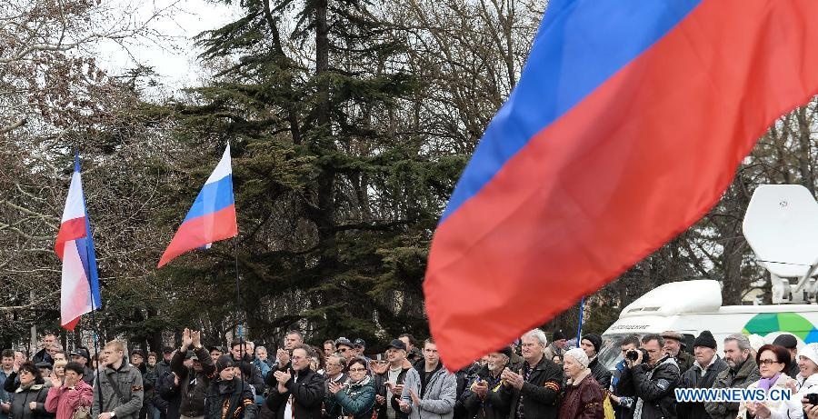 | Hàng trăm người tập trung để thể hiện sự ủng hộ Nga tại Simferopol hôm 2/3. Ảnh: news.cn |