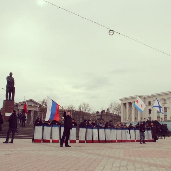 | Tự vệ lập hàng rào để bảo vệ tượng Lenin tại thành phố Simferopol hôm 2/3. Ảnh: RT |