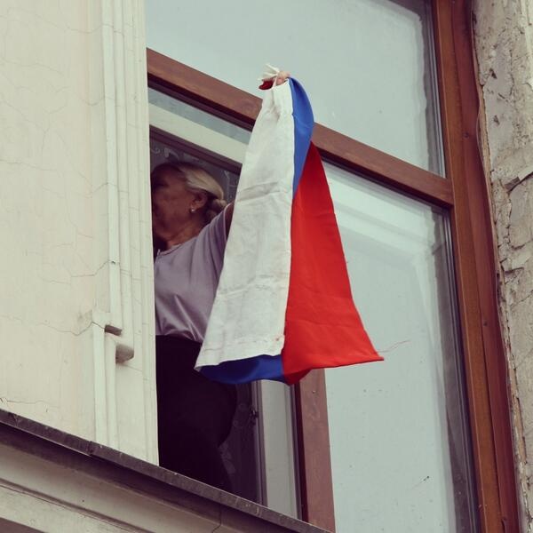 | Một phụ nữ chuẩn bị treo cờ Nga tại Simferoplo. Ảnh: RT |