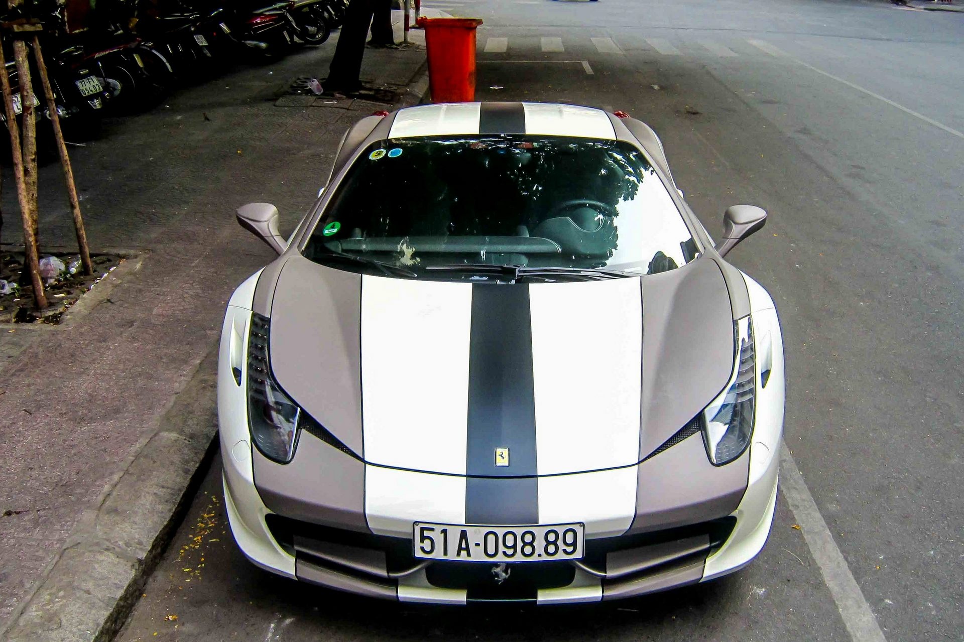 Ferrari 458 Italia được dán decal trắng - xám độc đáo. Xe nguyên bản màu trắng Bianco Avus, từng tham gia hành trình "Car Passion 2011".