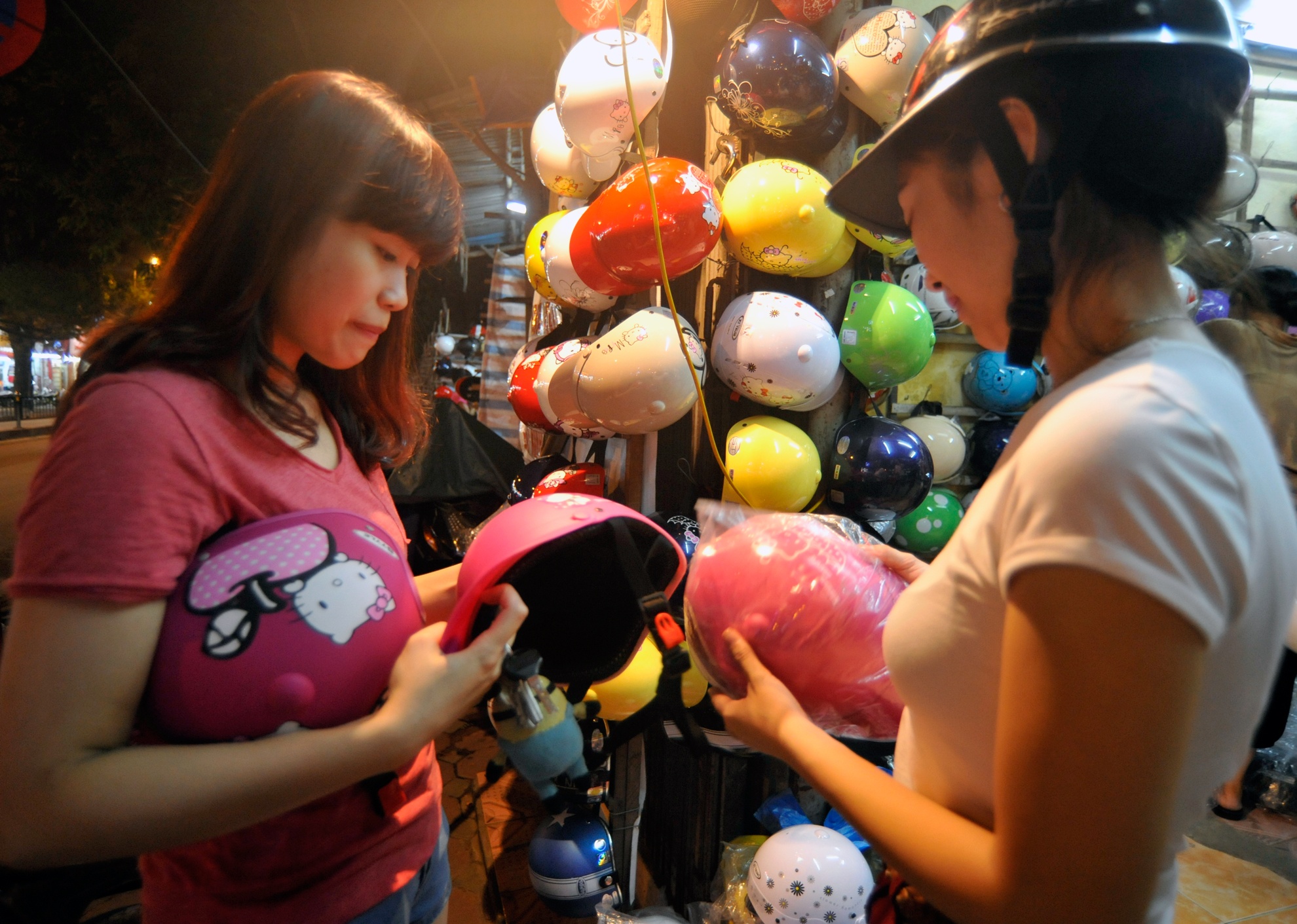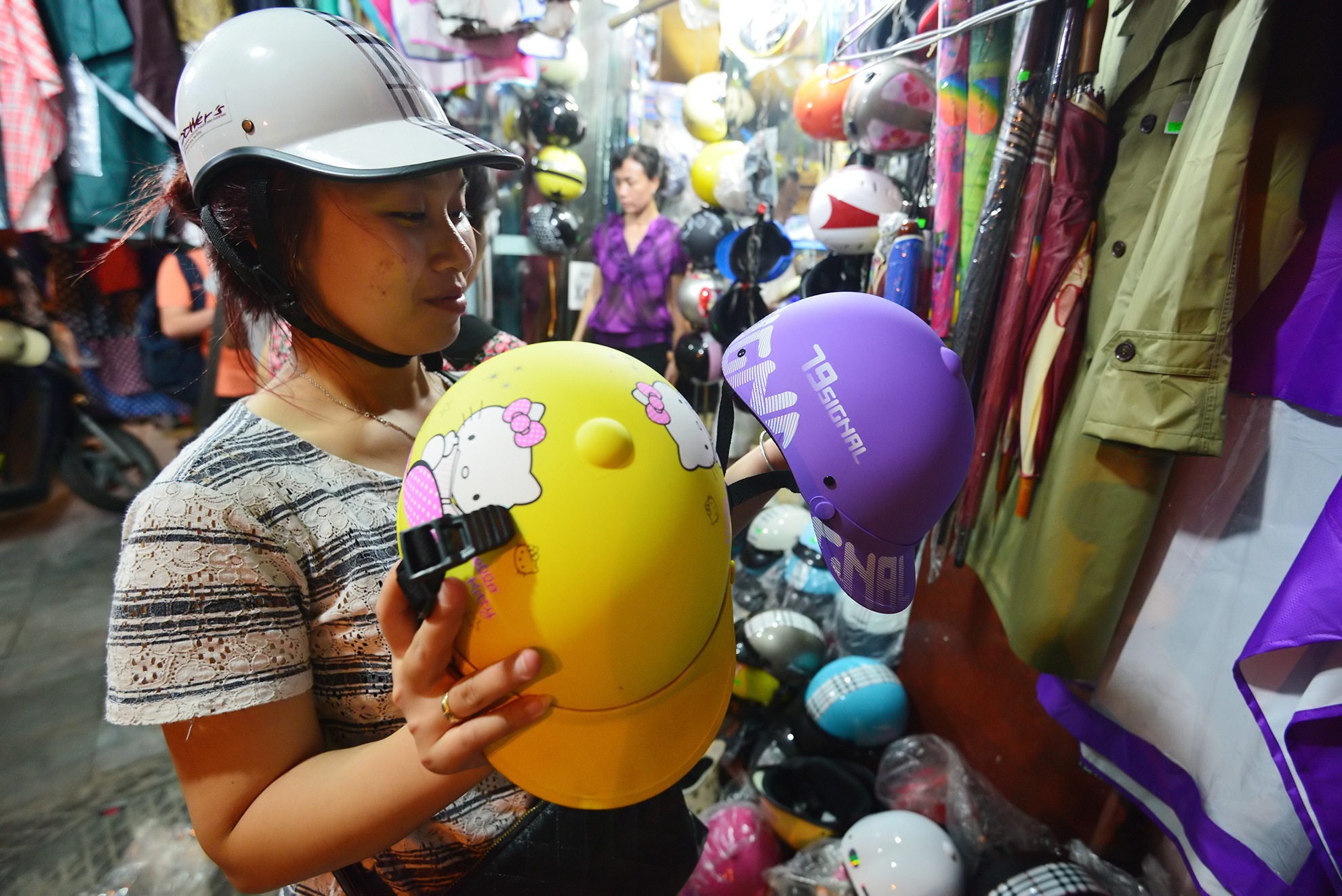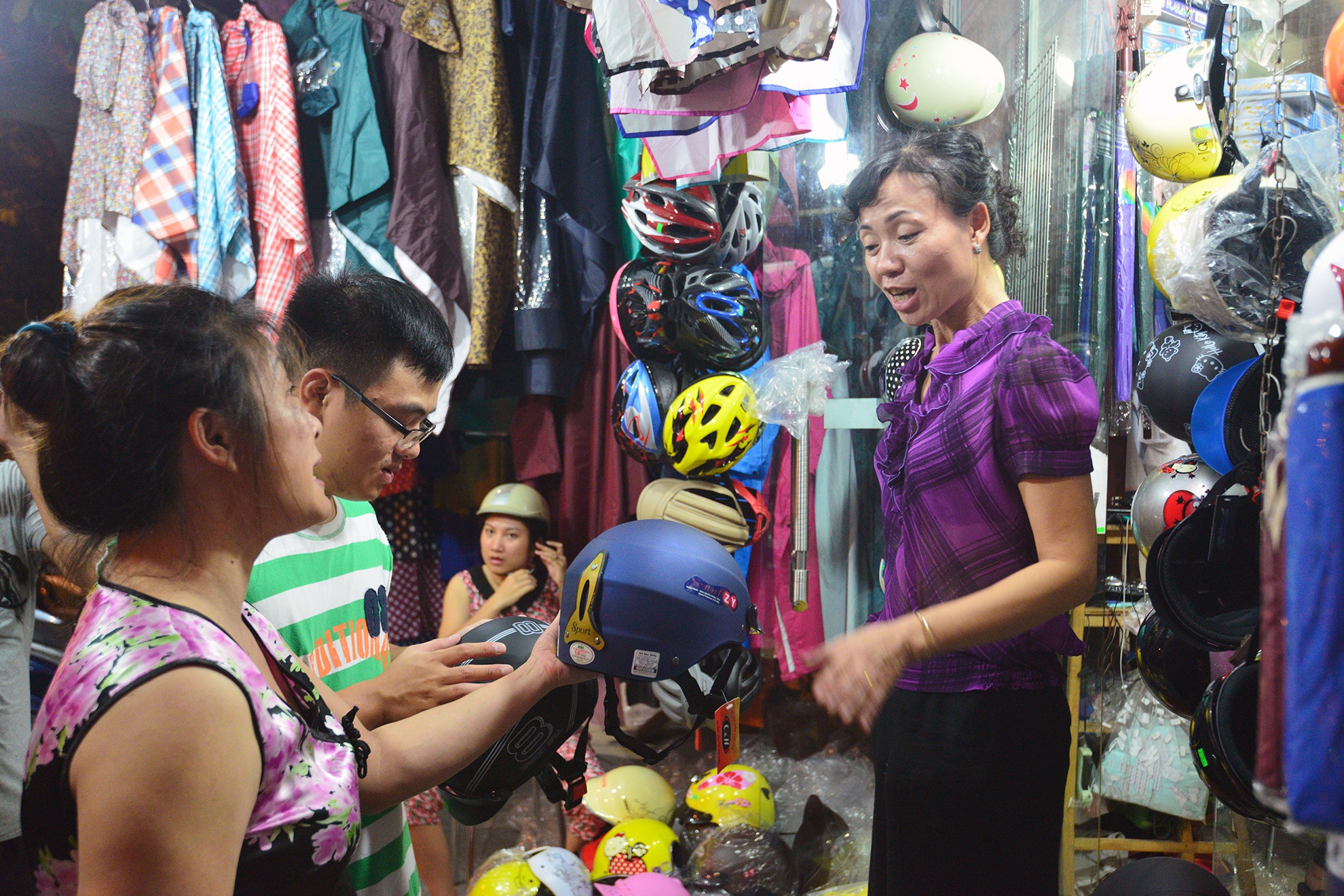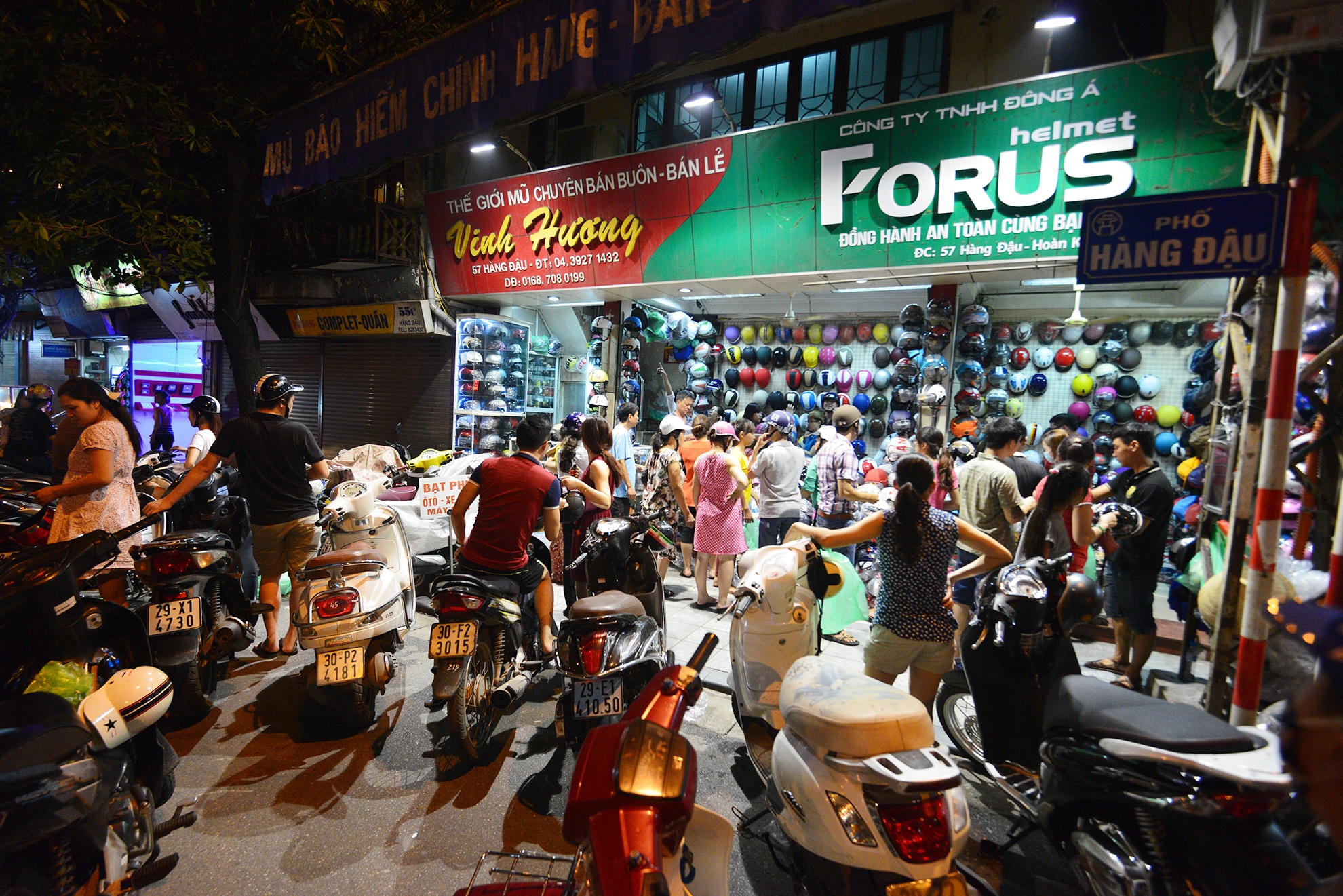 Trước ngày Hà Nội xử phạt người đi xe máy đội mũ bảo hiểm không đạt chuẩn, các cửa hàng trên nhiều tuyến phố nườm nượp người ra vào hơn thường lệ. Ảnh chụp lúc 21h tại một trung tâm mũ trên phố Hàng Đậu, quận Hoàn Kiếm. Ảnh: Lê Hiếu.