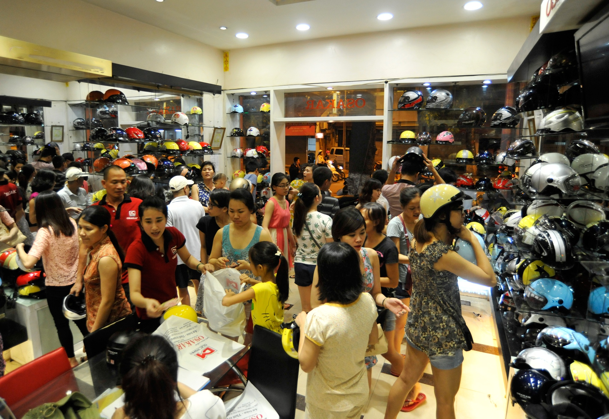 Tối 30/6, đông đảo người dân Hà Nội đổ xô đến các cửa hàng bán mũ bảo hiểm chất lượng để chọn loại đúng chuẩn theo quy định.
