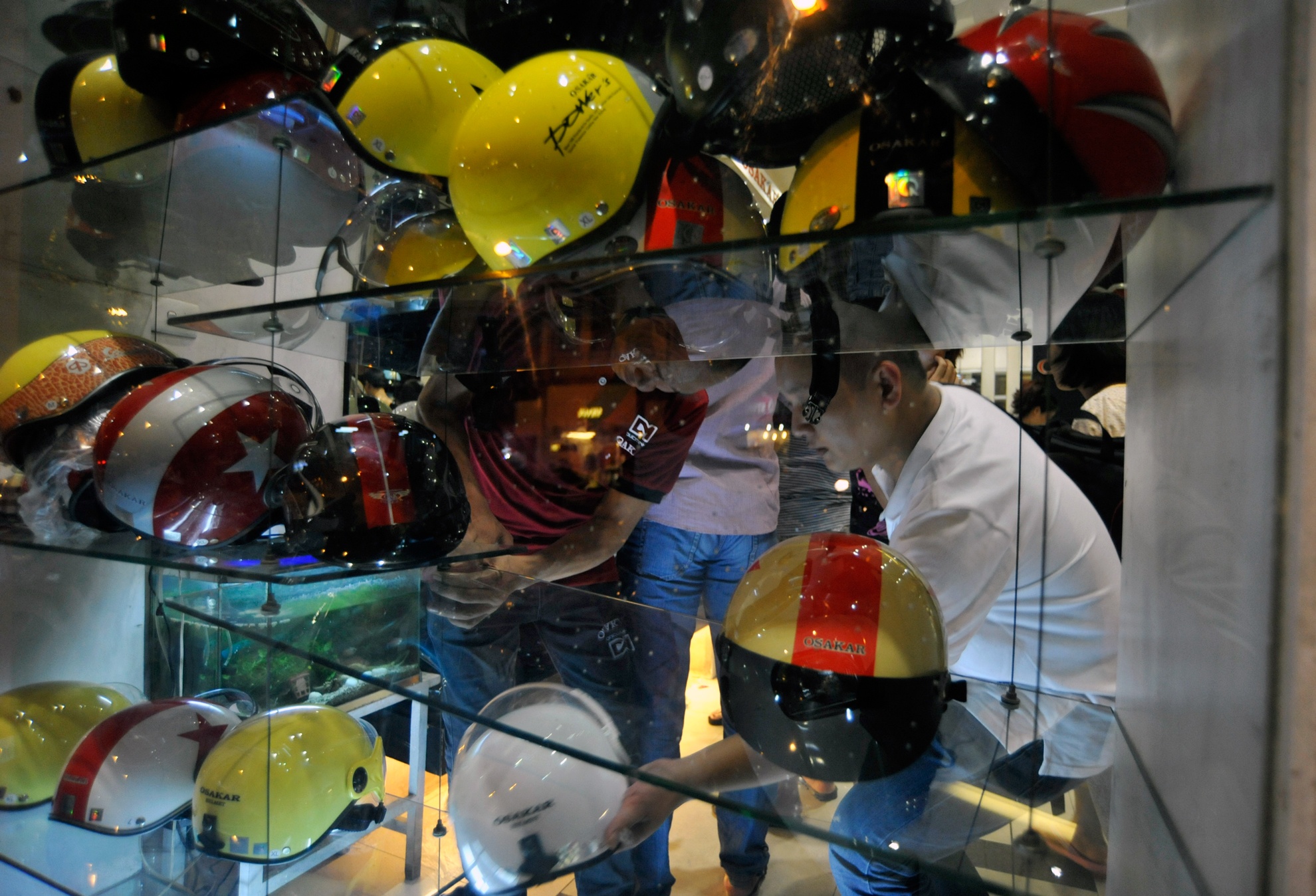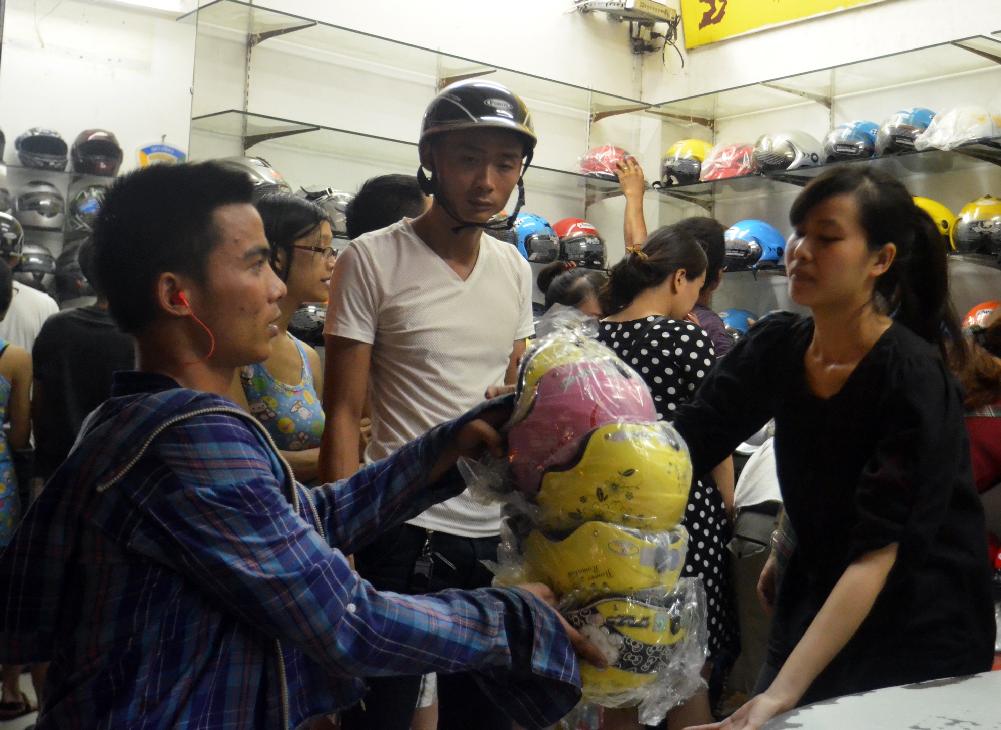 | Theo chủ cửa hàng Nguyễn Minh, lượng khách bắt đầu đông đột biến từ sau giờ hành chính chiều 30/6. "Ngoài những người đang dùng mũ loại tạm bợ có một hoặc hai lớp không đạt chuẩn thì hầu như còn lại là đều không tự tin về chất lượng và quy chuẩn của chiếc mũ đang đội nên vội vàng sắm thêm", ông Minh nói. |