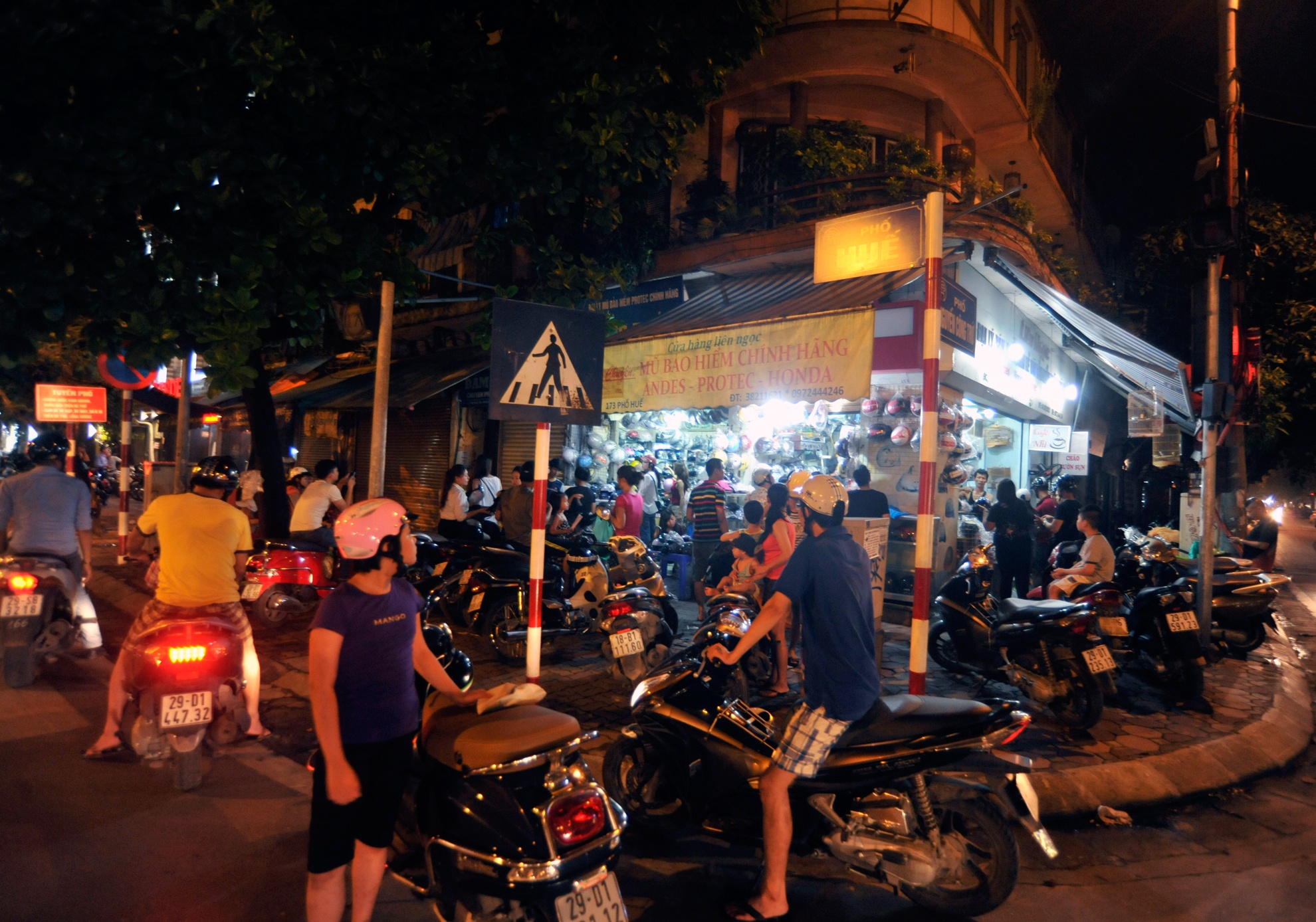 | Một cửa hàng kinh doanh mũ bảo hiểm khác có hai mặt tiền trên phố Nguyễn Công Trứ và Phố Huế, khách để xe kín vỉa hè và tràn xuống cả đường. |