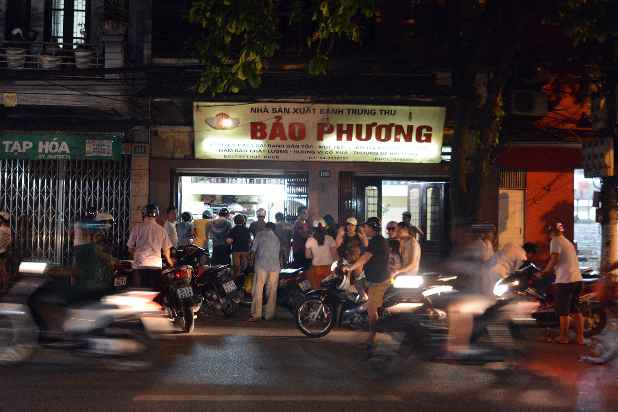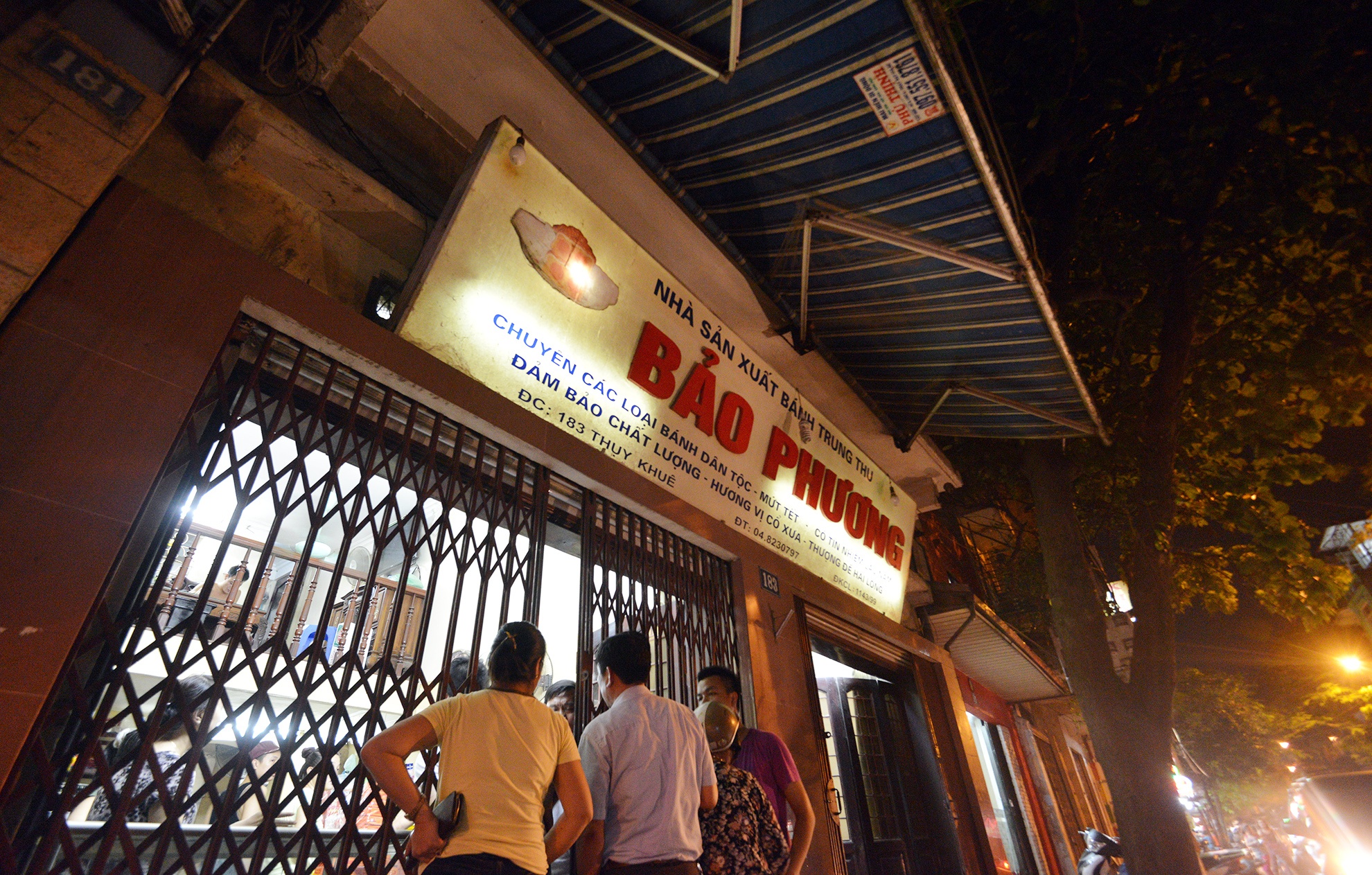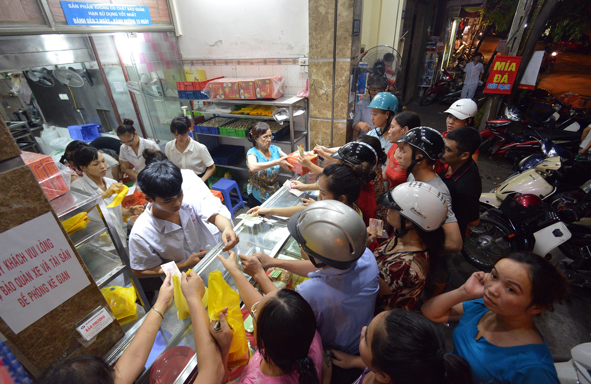 | Sát lễ Vu Lan, người dân tranh thủ đến cửa hàng bánh trung thu trên đường Thụy Khuê, Hà Nội để mua bánh cúng rằm. |
