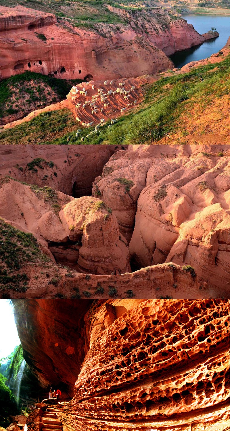 | Ngoài ra, theo thời gian, một phần vách núi sa thạch đỏ bị bào mòn tạo ra nhiều quần thể hang động kì ảo, với các kiểu dáng và kích thước khác nhau. Điều đặc biệt là các hang động này hầu hết đều cạn và tách biệt, chứ không có xu hướng thông sâu hay liên kết với nhau như hệ thống hang động ở những nơi khác. |