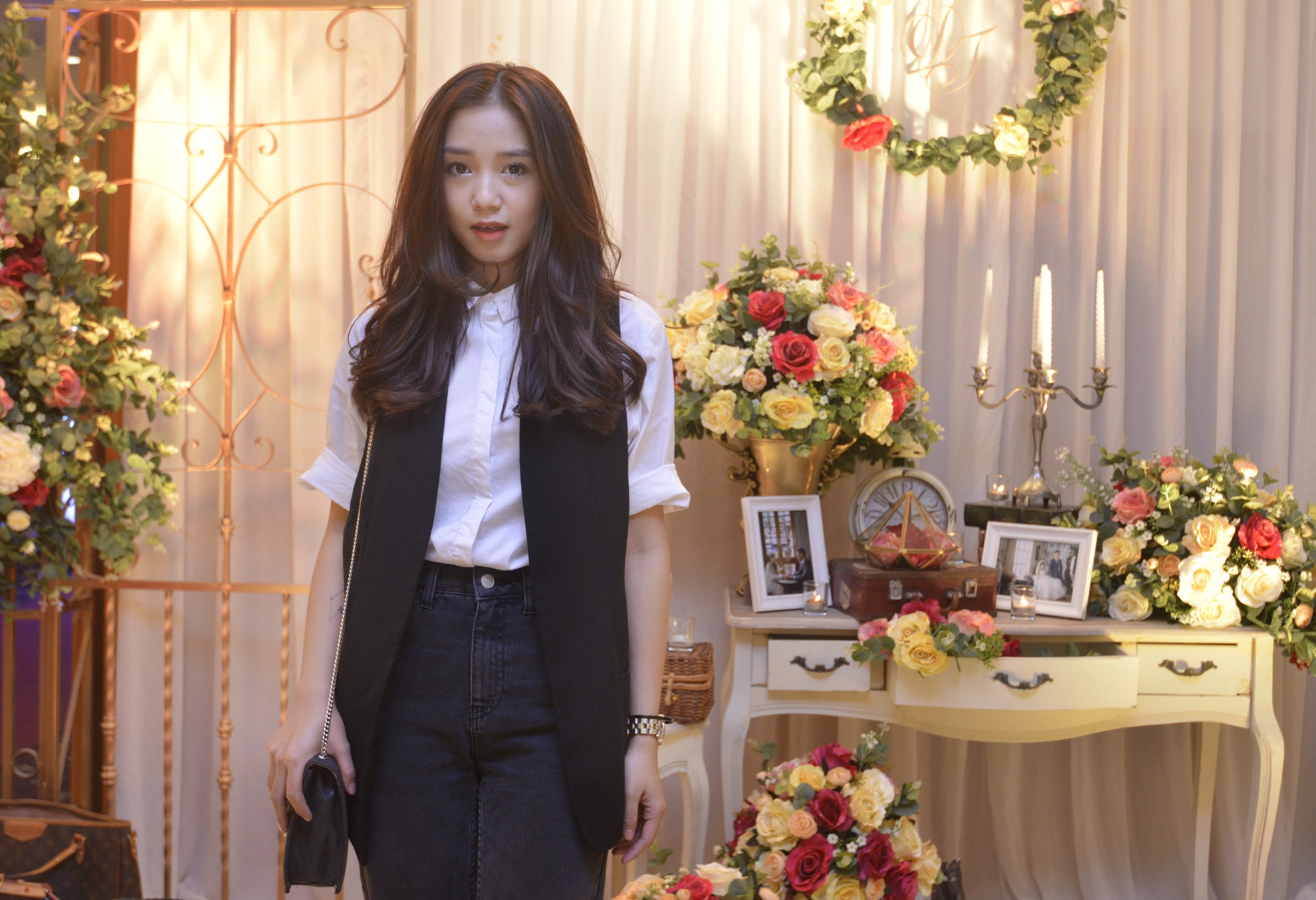 | Hot girl Salim đến khá muộn vì tắc đường. Cô khéo léo kết hợp sơmi trắng với áo khoác đen, tạo nên phong cách khá cá tính. |