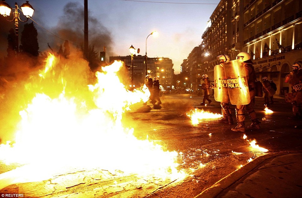 Quyết định của Quốc hội Hy Lạp thổi bùng sự giận dữ trong dân chúng. Những người phản đối đổ xuống các tuyến phố ở thủ đô Athens. Ảnh: Reuters