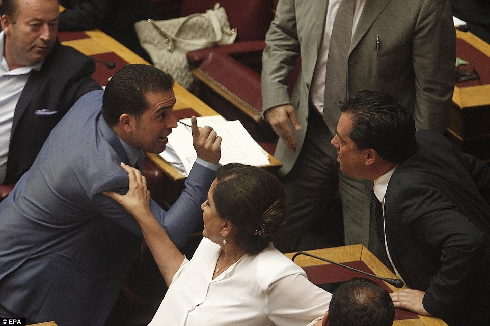 Xung đột nảy ra ngay trong Quốc hội Hy Lạp khi các nghị sĩ tranh cãi về việc chấp thuận hay phản đối cắt giảm các khoản chi phí, tăng thuế giá trị gia tăng và cải cách hưu trí để đổi lấy gói cứu trợ trong 3 năm tới. Ảnh: EPA