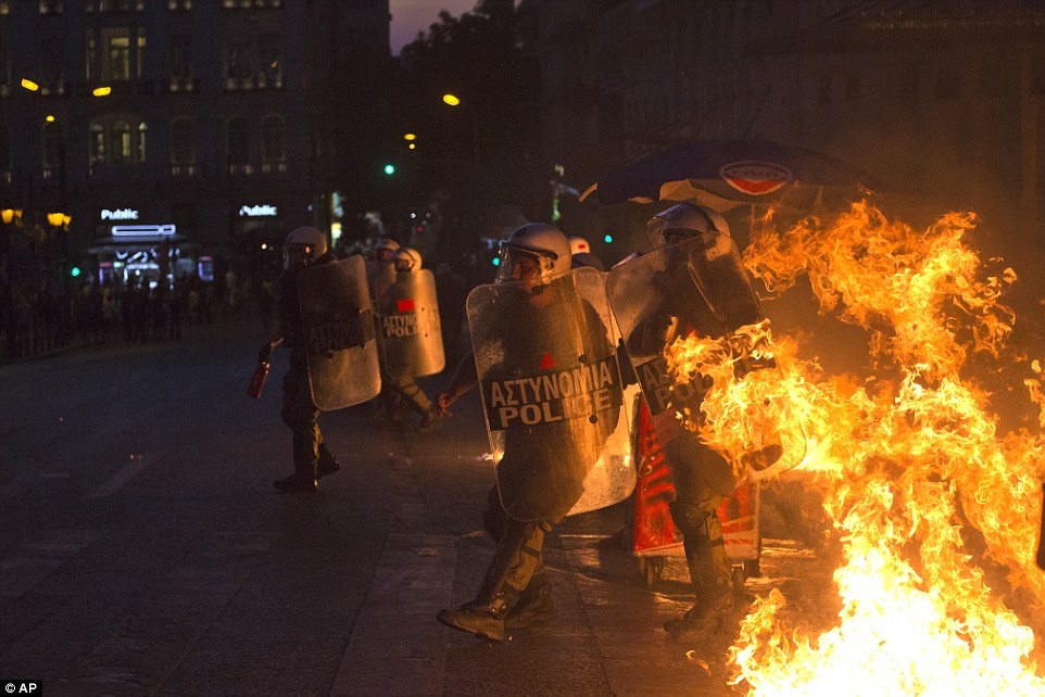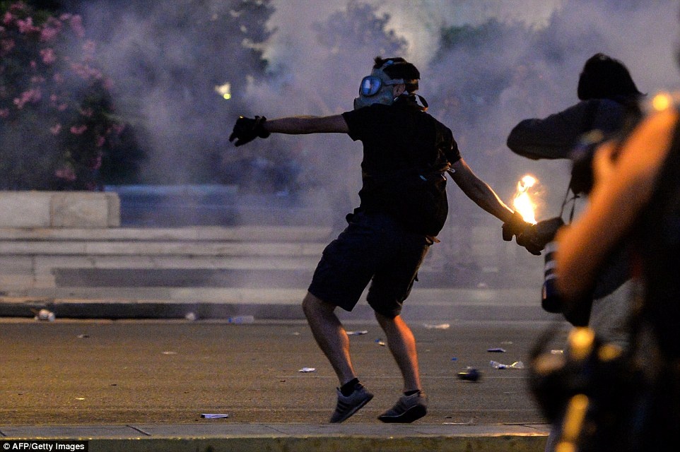 Người biểu tình ném bom xăng vào cảnh sát làm nhiệm vụ bảo vệ bên ngoài tòa nhà Quốc hội của Hy Lạp. Bạo lực bùng phát sau khi Quốc hội họp để bỏ phiếu về các điều khoản khắc nghiệt mà chủ nợ đưa ra nhằm giữ Athens ở lại với khu vực các nước sử dụng đồng tiền chung châu Âu (Eurozone). Ảnh: AP
