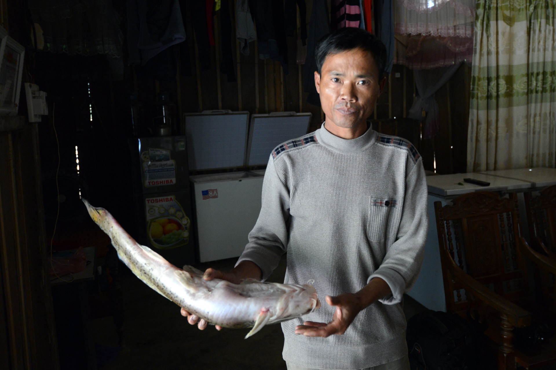 Men theo đường sông khoảng 15km nữa chúng tôi đến nhà ông Trần Văn Tường (47 tuổi, ở thông Pác Sáng, thị trấn Yên Phú, huyện Bắc Mê). Ông Tường cho rằng mình bị chết khoảng 1 tấn cá vì nước sông ô nhiễm từ chất thải bùn chì của công ty CKC chảy ra.