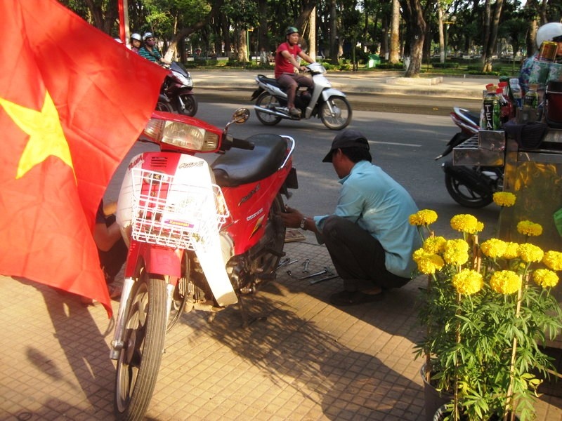 | "Đối với dân lao động như chúng tôi, Tết là dịp là kiếm thêm chút thu nhập lo cho gia đình", anh Hiên (quê Cần Thơ), thợ vá xăm xe, nói. |