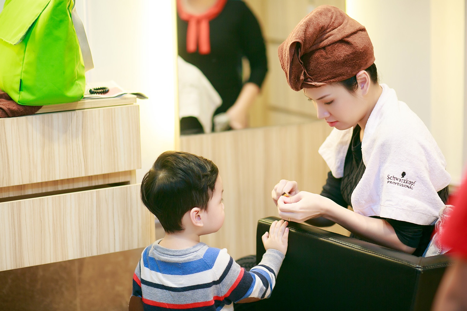 Đan Lê dắt con trai dễ thương đi cắt tóc