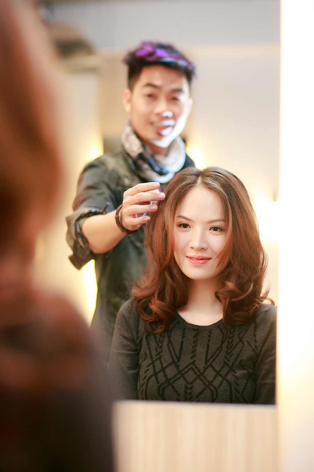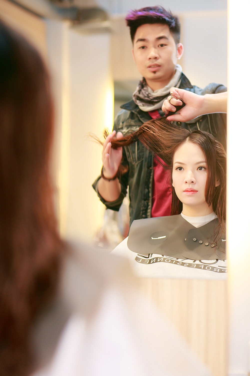 Sau đó, cậu nhóc Khải Minh cũng được cắt tóc. Người bạn thân của Đan Lê là nhà tạo mẫu tóc Quang Vinh đích thân ra tay tỉa tóc cho hot boy này.