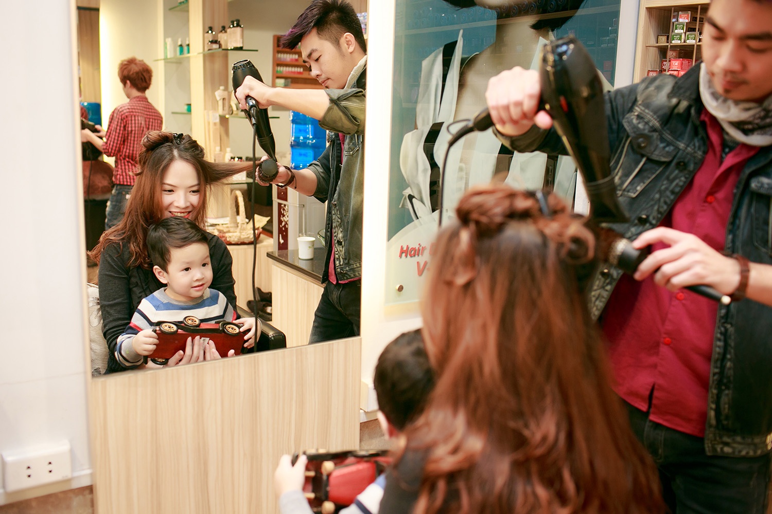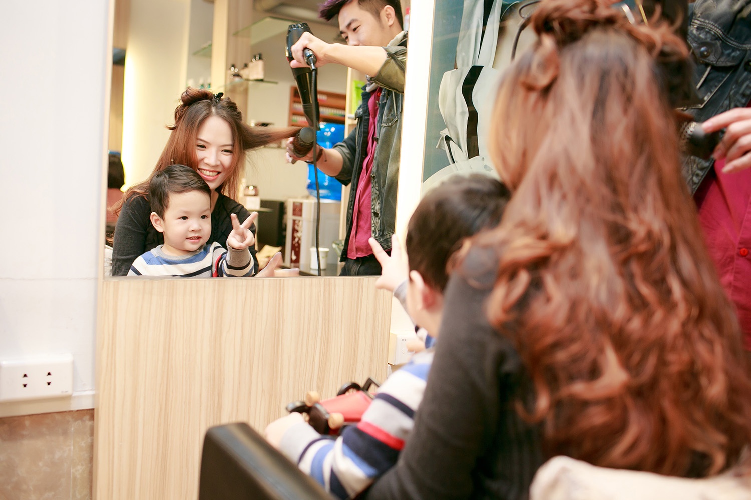 Chuẩn bị có thêm em nhỏ trong nhà, Khải Minh tỏ ra khá chững chạc và tự tin. Cậu nhóc thoải mái đi dạo, chơi đùa cùng các cô chú trong salon lúc mẹ đang gội đầu và chuẩn bị cắt tóc.
