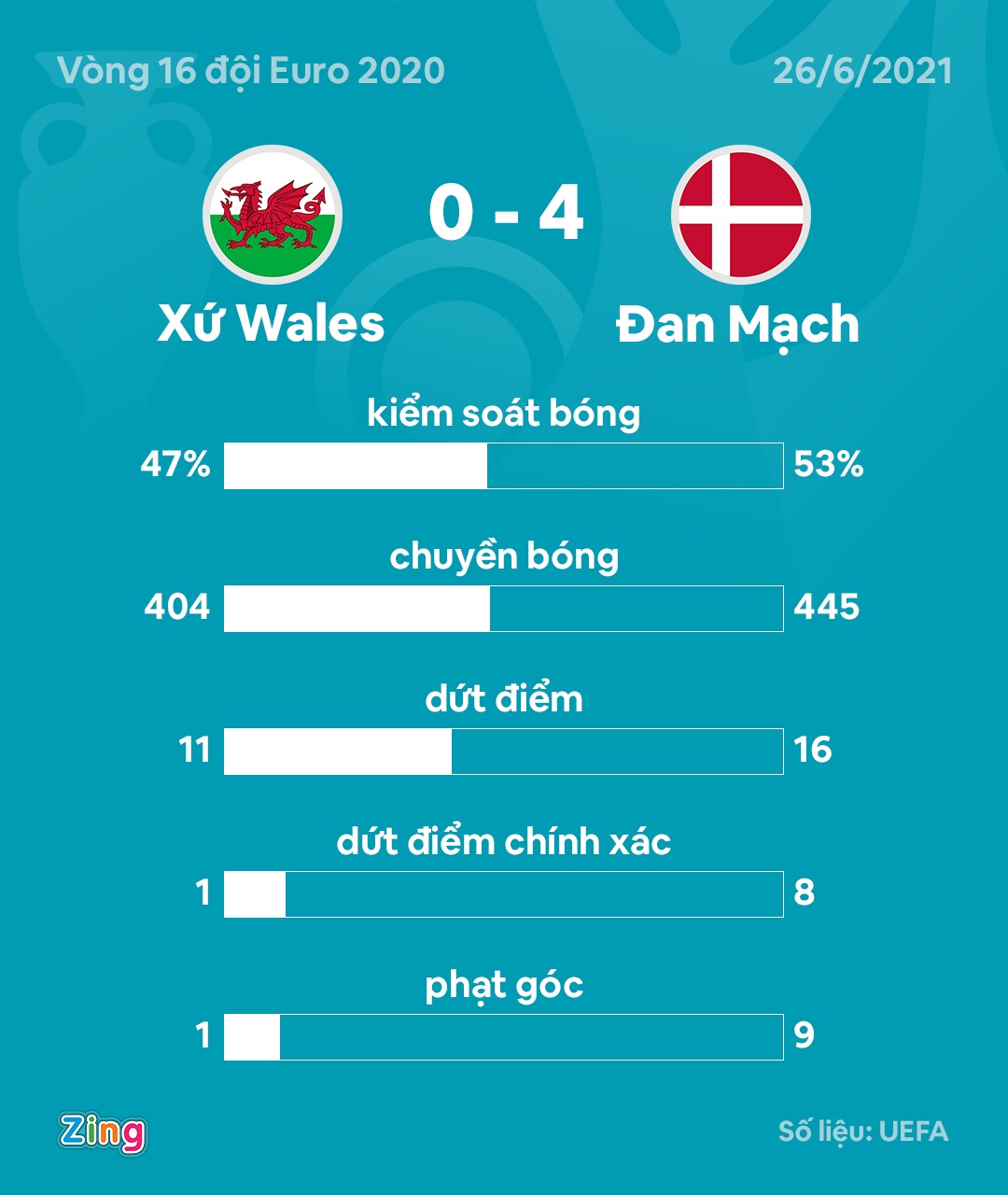 | Cú đúp của Kasper Dolberg cùng bàn của Maehle, Braithwaite biến xứ Wales thành đội tuyển đầu tiên bị loại khỏi vòng knock-out Euro 2020. "Những chú lính chì" thi đấu ngày càng hay. Theo trang thống kê The Analyst, trong 2 trận đầu, Đan Mạch sút 43 lần những chỉ ghi 1 bàn. Ở 2 trận sau, họ tung 32 cú sút nhưng đã thu về 8 bàn thắng. |
