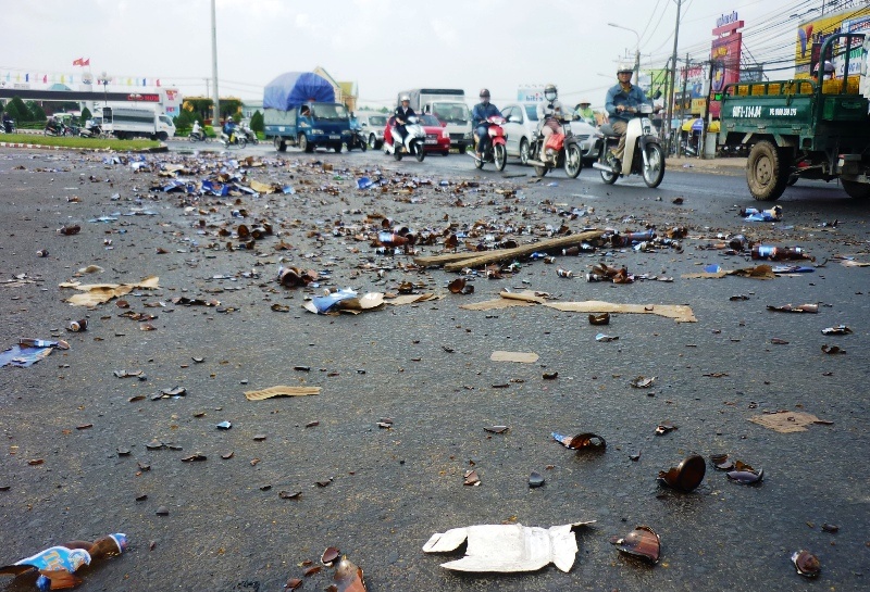 Vì đang đi với tốc độ cao nên khi bất ngờ đổi hướng, hàng ngàn két bia Tiger trên thùng xe đã đổ xuống đường. Rất may vụ tai nạn không gây thiệt hại về người. Trong số bia bị đổ xuống đường, ngoài bia chai thì có nhiều thùng bia lon.