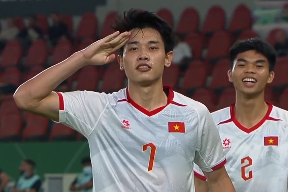 Đình Bắc ghi bàn thắng đẳng cấp trong trận đối đầu U23 Saudi Arabia. Ảnh chụp màn hình. |