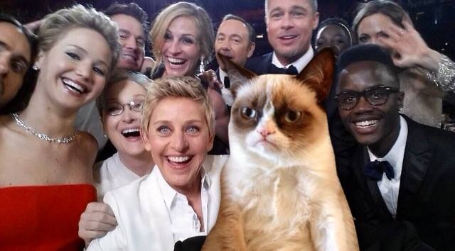 | Chú mèo nổi tiếng Grumpy cũng có một phiên bản chế không lâu sau khi bức hình tự sướng của dàn sao Hollywood được đăng tải. |