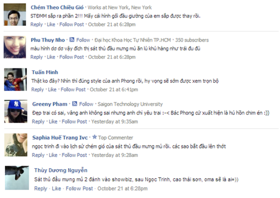 Một thành viên có tên “Phu Thuy Nho” khẳng định chắc chắn: “Màu hình dơ dơ vậy đích thị là sát thủ đầu mưng mủ!”. Bạn David Chen tỏ ra phấn khích: “Anh Phong đã trở lại và ‘hư hỏng’ hơn xưa!”...