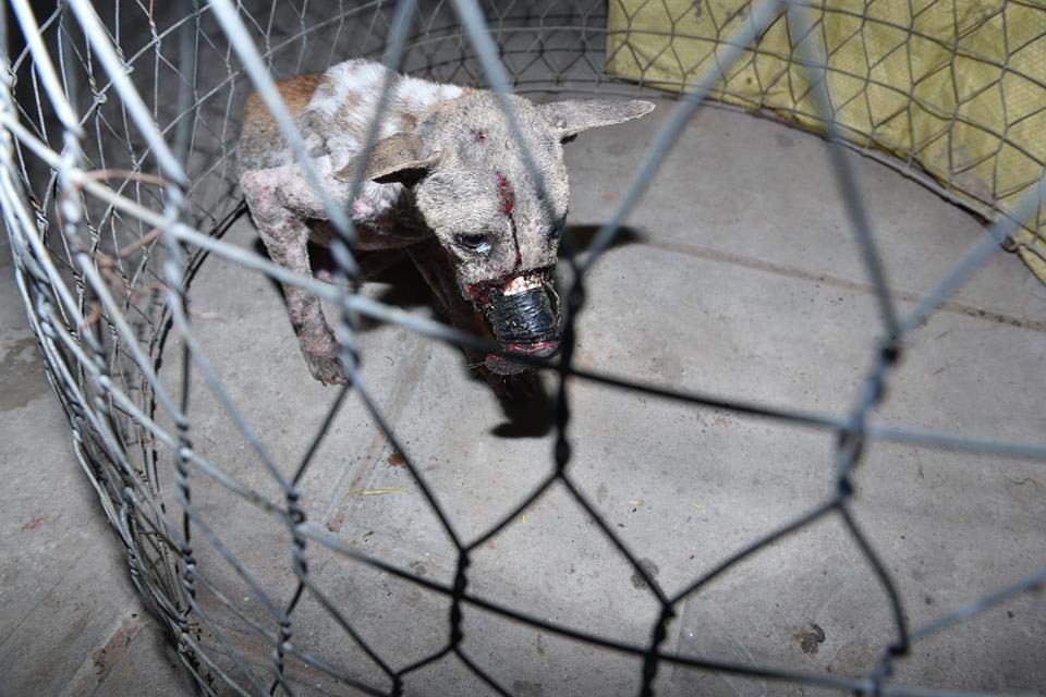 | Chú chó được tìm thấy sau nhiều ngày không được ăn. Phần mõm bị hoại tử nặng. Ảnh: Điền Nguyễn. |