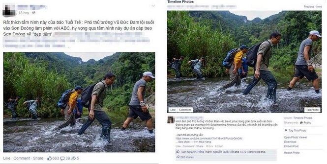 Bạn L.N.H.T đăng lên trang cá nhân tấm ảnh cùng dòng bình luận: "Hình ảnh Phó thủ tướng Vũ Đức Đam vác ba lô, phục trang giản dị lội suối vào Sơn Đoòng tham gia chương trình Good morning America của ABC với phần trả lời phỏng vấn bằng tiếng Anh thật sự ấn tượng".