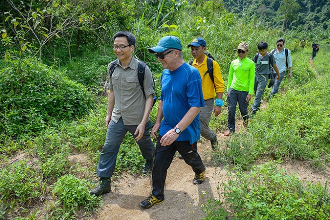 | Phó thủ tướng Vũ Đức Đam và chuyên gia Hội hang động Hoàng gia Anh Howard Limbert trên đường vào hang Én trả lời phỏng vấn kênh truyền hình ABC. |