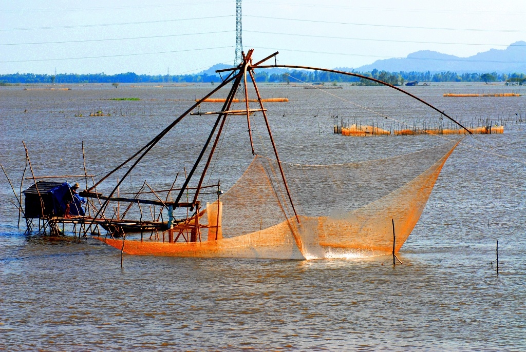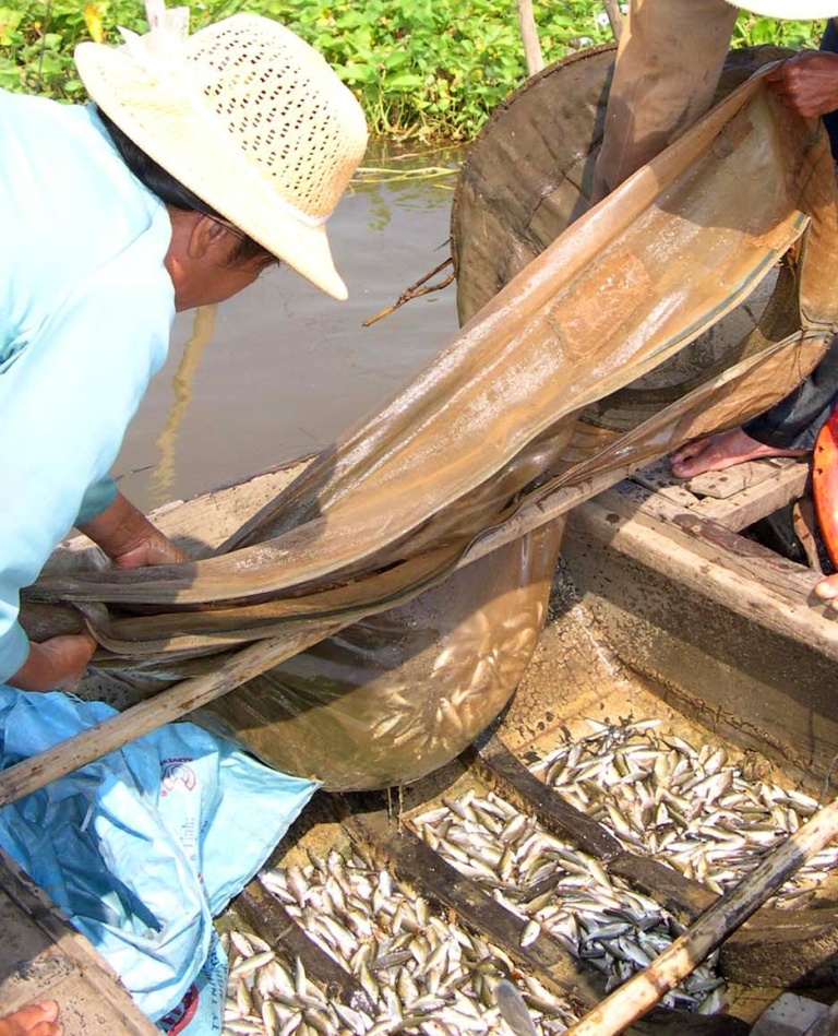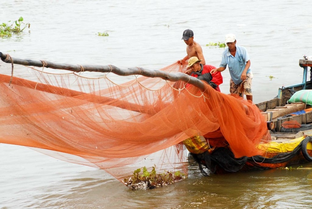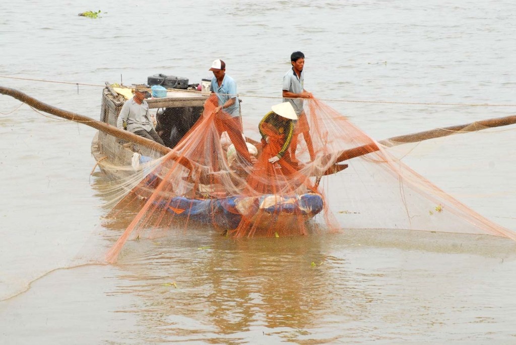 Ngư dân huyện An Phú – An Giang đánh bắt cá linh đầu mùa bằng lưới đáy ở nơi nước chảy xiết. Với cách đánh bắt này, 3-4 lao động có thể thu từ 1-2 tấn cá linh non mỗi ngày.