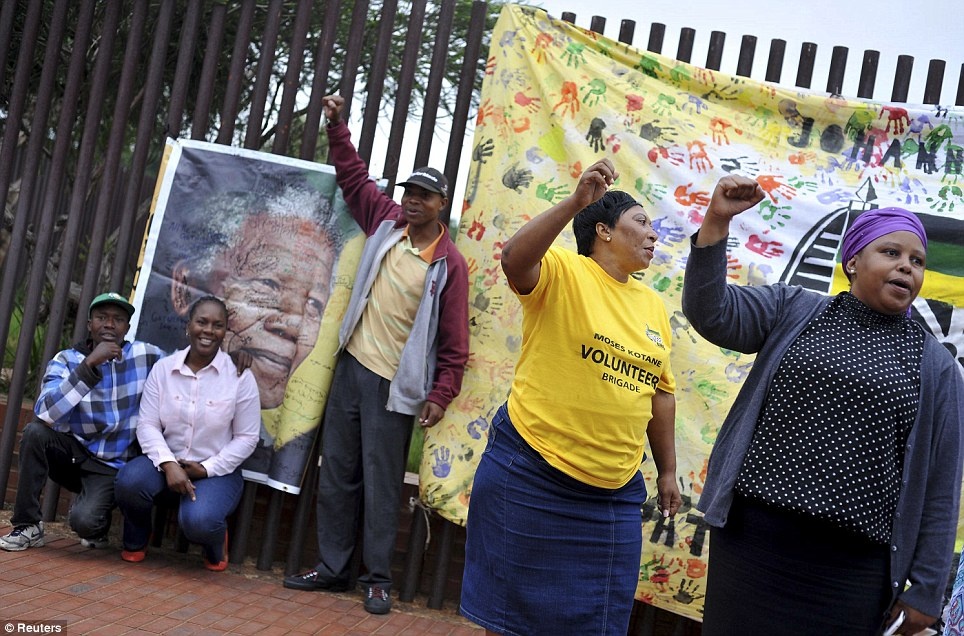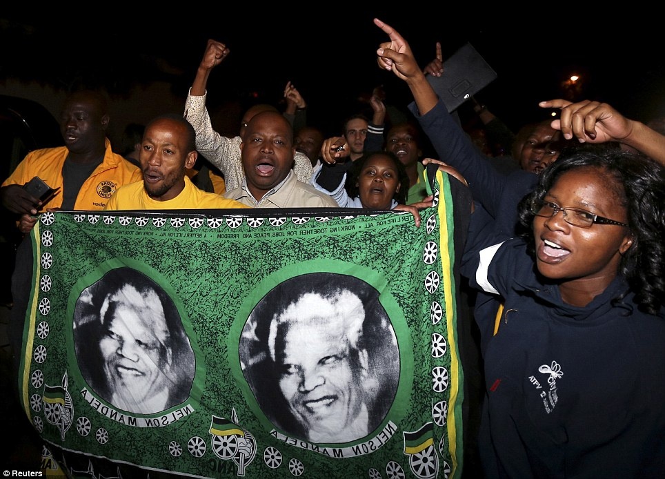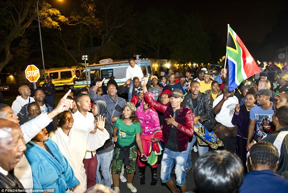 Hàng trăm người dân tụ tập tại thị trấn Houghton ở ngoại ô thành phố Johannesburg sau khi cựu tổng thống Nelson Mandela qua đời. Họ hát và nhảy để tiễn biệt vị anh hùng dân tộc. Ảnh: Reuters.