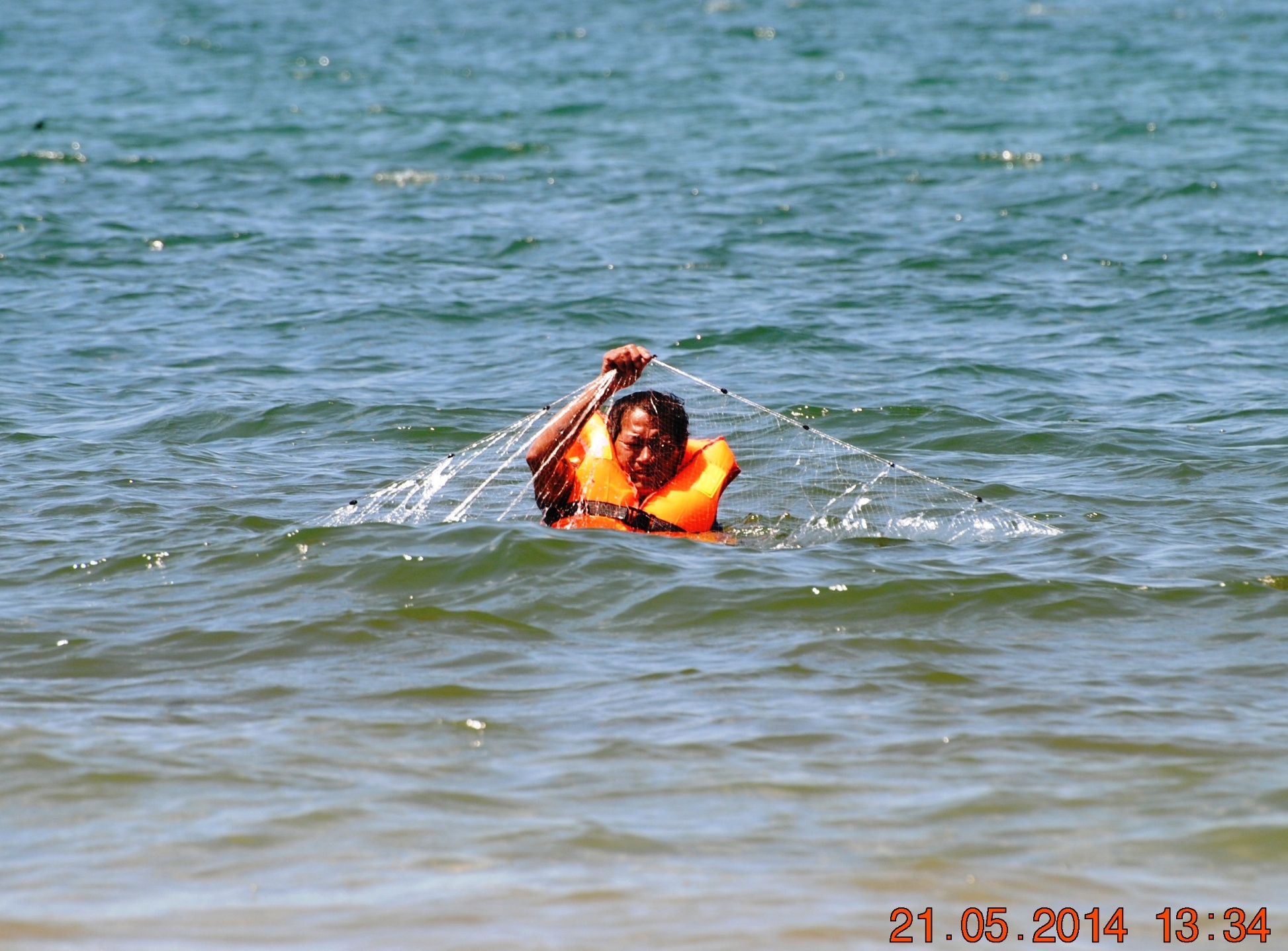 | Liên tục nhiều ngày qua, nhiệt độ ngoài trời ở Quảng Bình luôn đạt 37-40 độ C. Nhiều người không muốn ra đường. Tuy nhiên, các lao động nghèo vẫn trầm mình mưu sinh trong cái nắng gắt. Trong ảnh: Hai vợ chồng đang thả lưới, bắt cá trên sông Nhật Lệ. Người phụ nữ trùm kín người để tránh cái nóng như thiêu như đốt. |