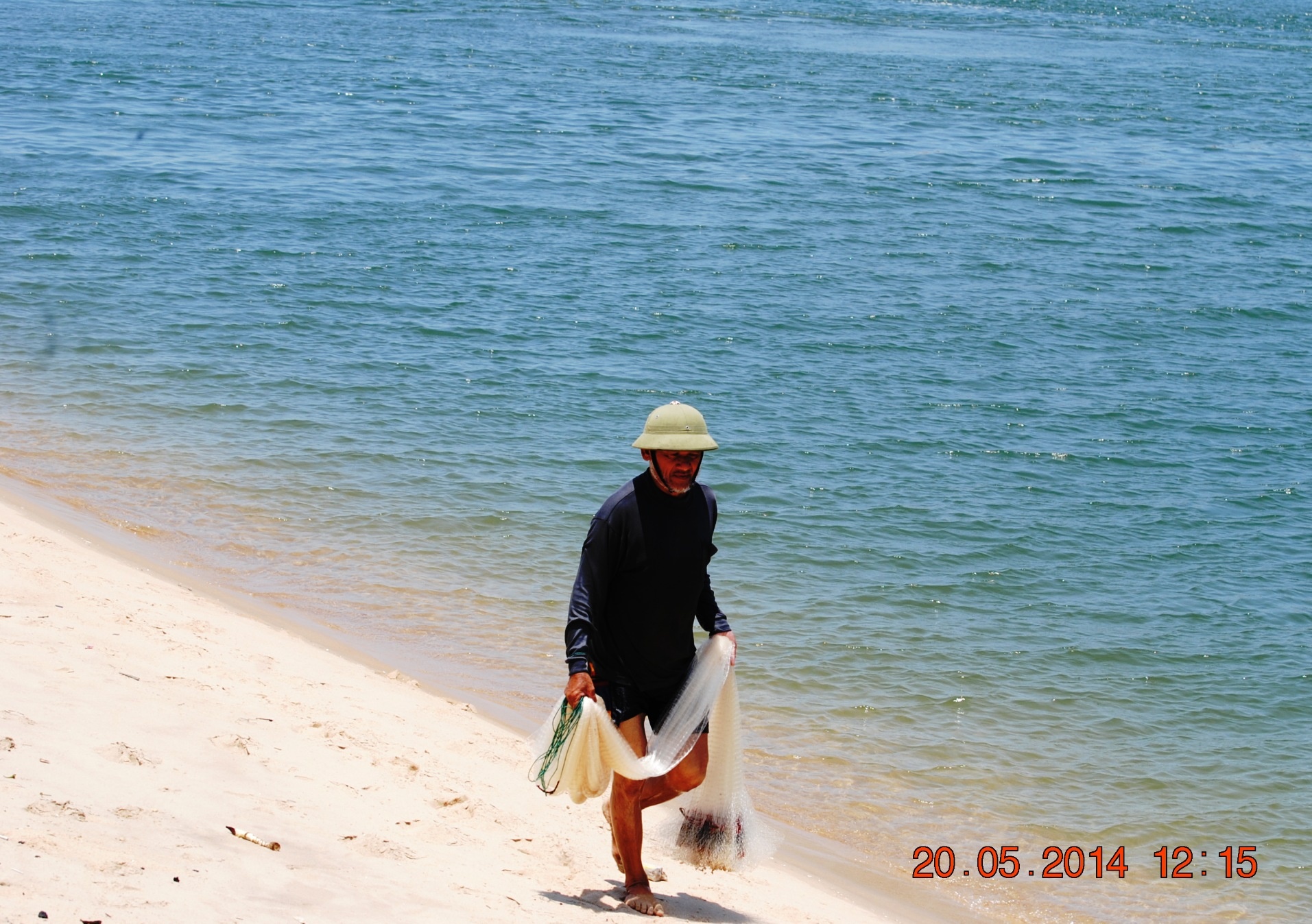 | Ở bãi cát dọc sông Nhật Lệ, một lão ngư đang tìm nơi quăng chài. |