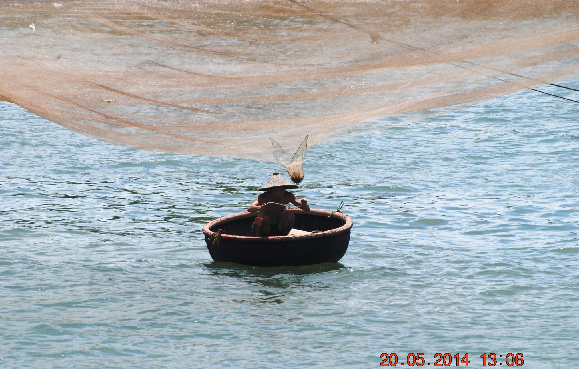| Một lão ngư cởi trần, chèo thúng ra giàn lưới trên sông Nhật Lệ để gỡ những con cá vừa kéo lên. |