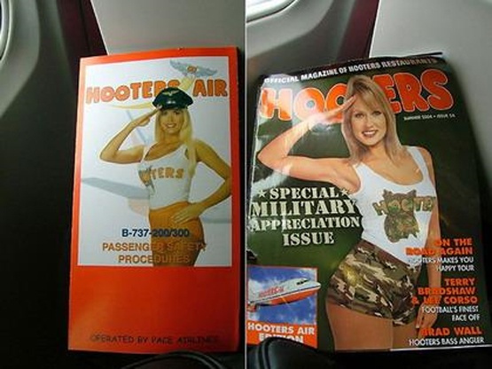 | Hooter Air hoạt động theo phương châm: Các hành khách khi bước lên máy bay sẽ giống như bước vào một nhà hàng, được các quý cô ăn mặc gợi cảm hướng dẫn ghế ngồi và phục vụ đồ ăn. |