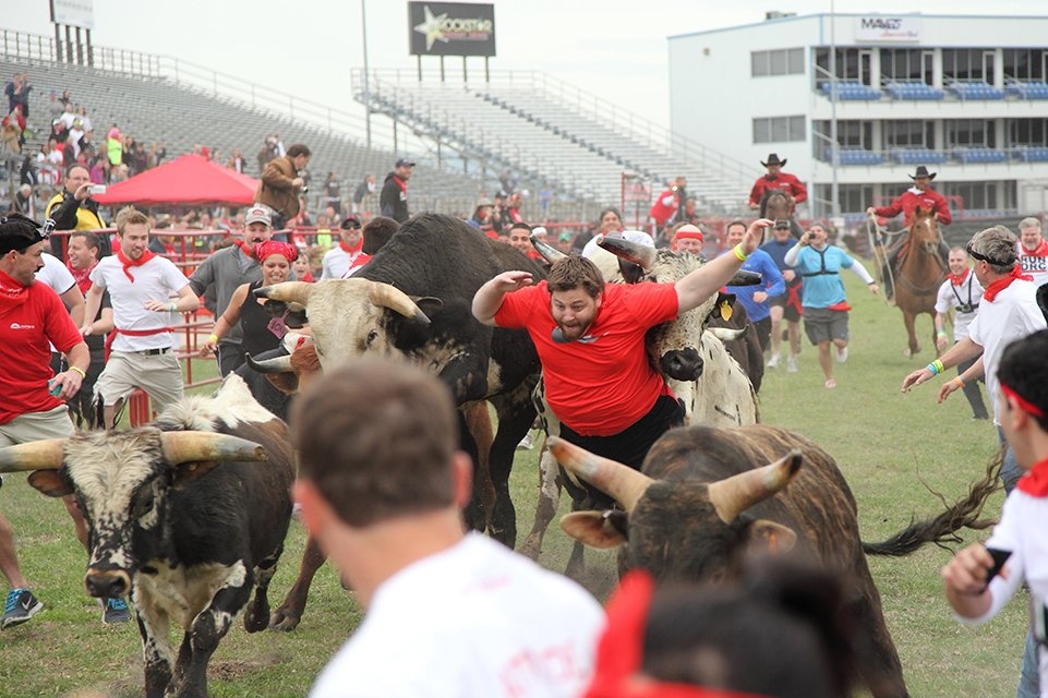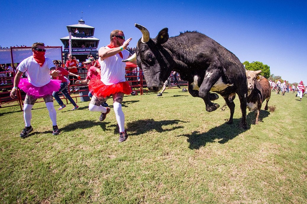 Những con bò rượt người ở Virginia. Quy mô lễ hội ở Mỹ nhỏ hơn ở Tây Ban Nha. Tuy nhiên, người dân vẫn rất thích thú sự kiện độc đáo này. |