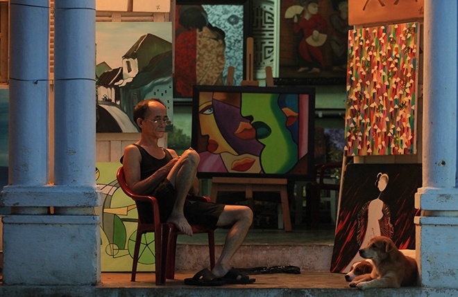 | Ngoài vỉa hè đường Trần Phú, một người đàn ông tĩnh lặng thư thái đón trung thu theo cách của riêng mình. |