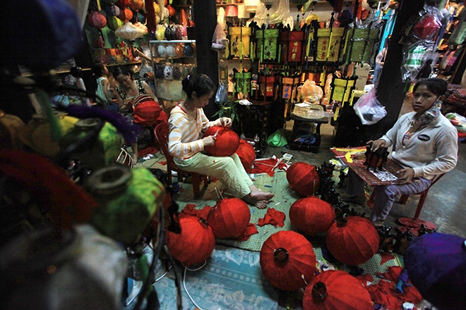 | Các hàng bán đèn lồng tất bật phục vụ khách. |